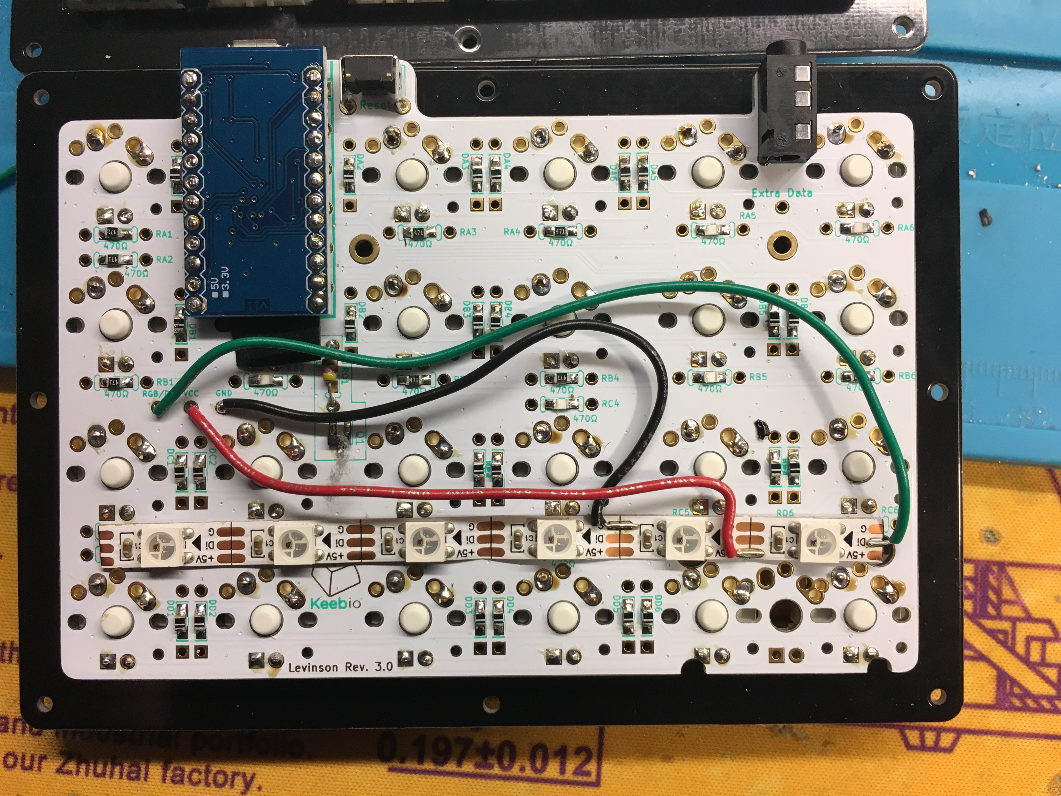 As for the other two pins, Din needs to be connected on the first LED on the strip, and Dout needs to be connected to the last LED on the strip on the master side of the board. The flow of RGB data from the Pro Micro and through the strip is like this: