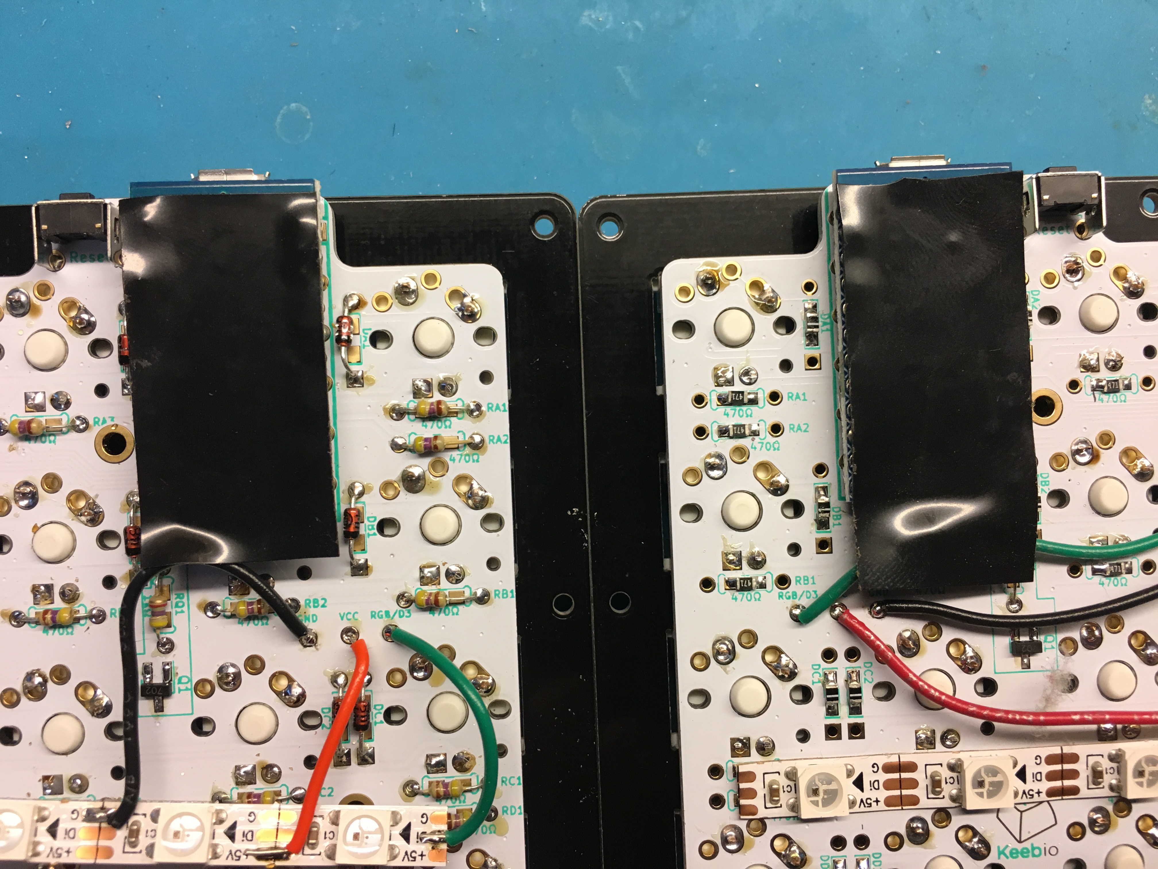 There are two methods for wiring in RGB strips. The older way is to wire the strips of each half as a single chain. The issue with this is that the RGB strips with only work when the USB cable is plugged into the half wired up as master, as only the controller on the master half controls the RGB strips on both halves.