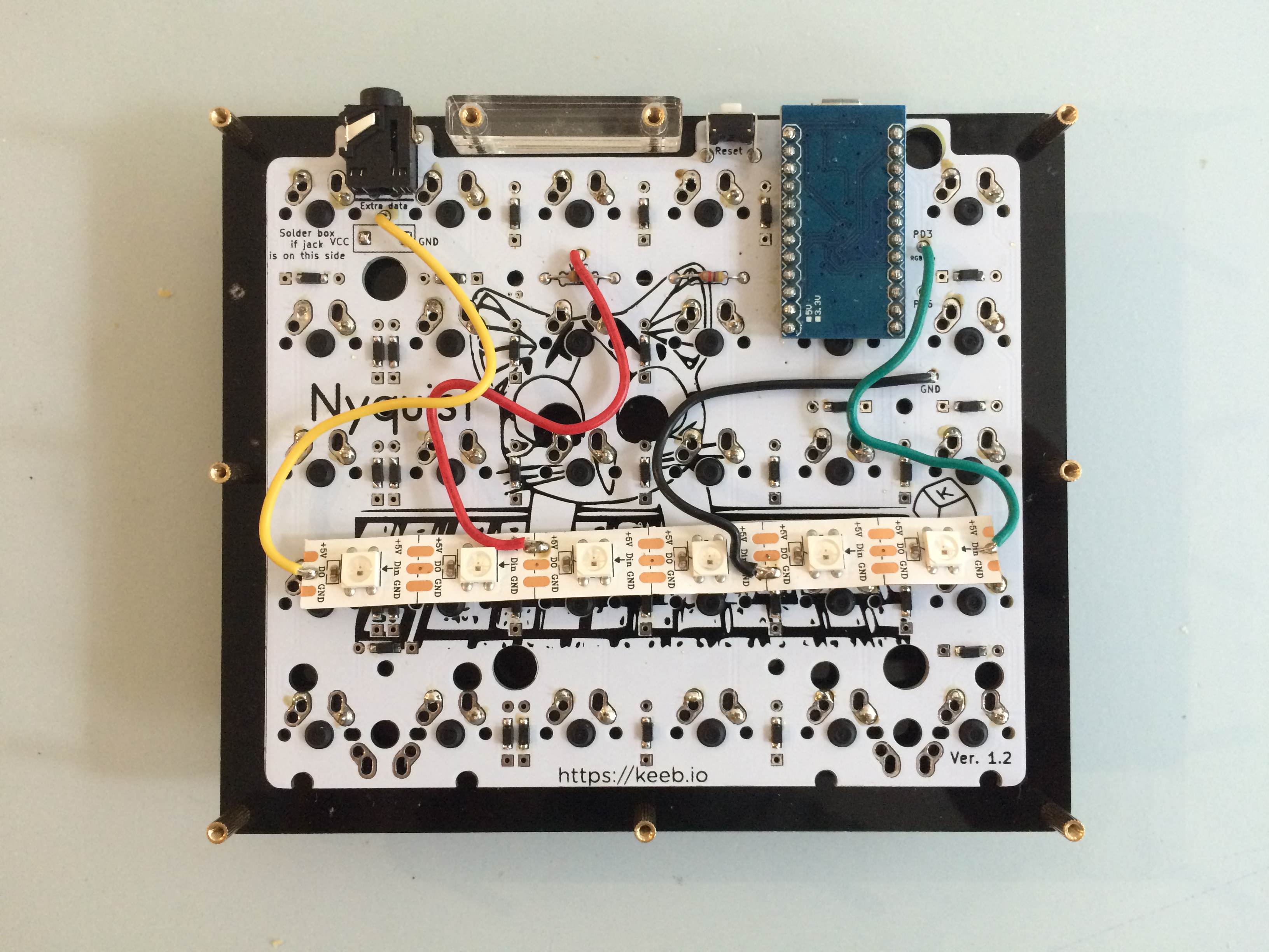 - Din on strip connects to PD3 breakout pad on PCB (on some boards, this may be marked as RGB instead)