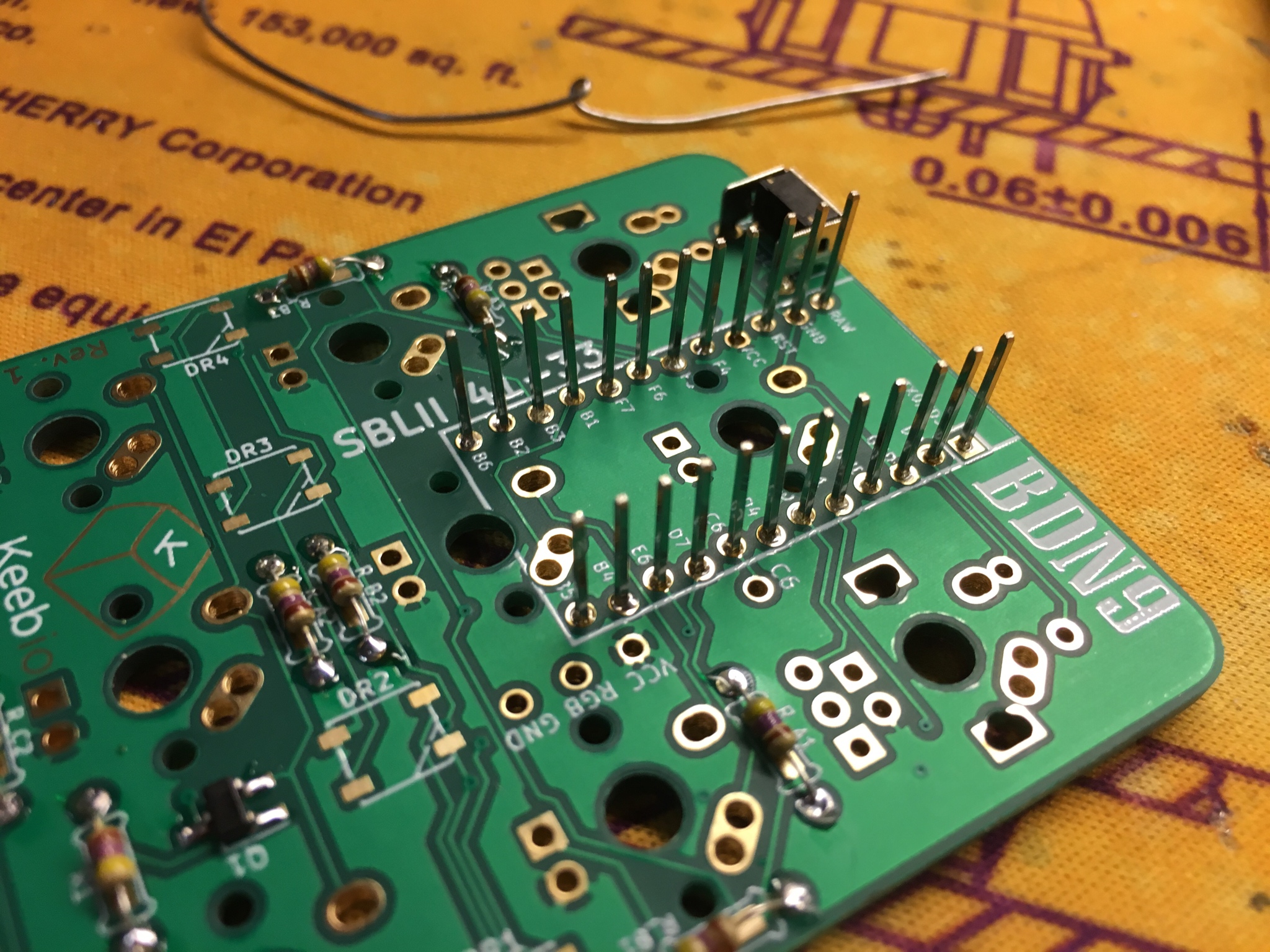 (Optional) An alternative method for soldering in the header pins is shown above. Flip the header pins upside down and solder them in. Then remove the plastic on the header pins by prying it off. The benefit of doing this method is that the Pro Micro Micro-USB port will be flush against the PCB, which helps from getting it ripped off.