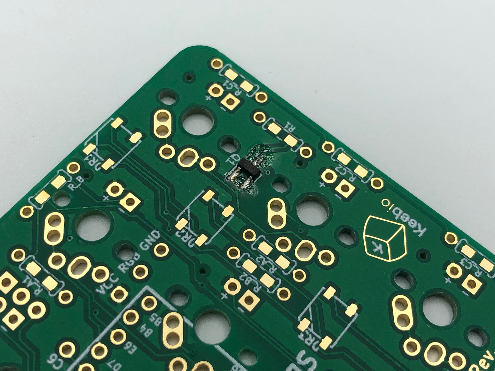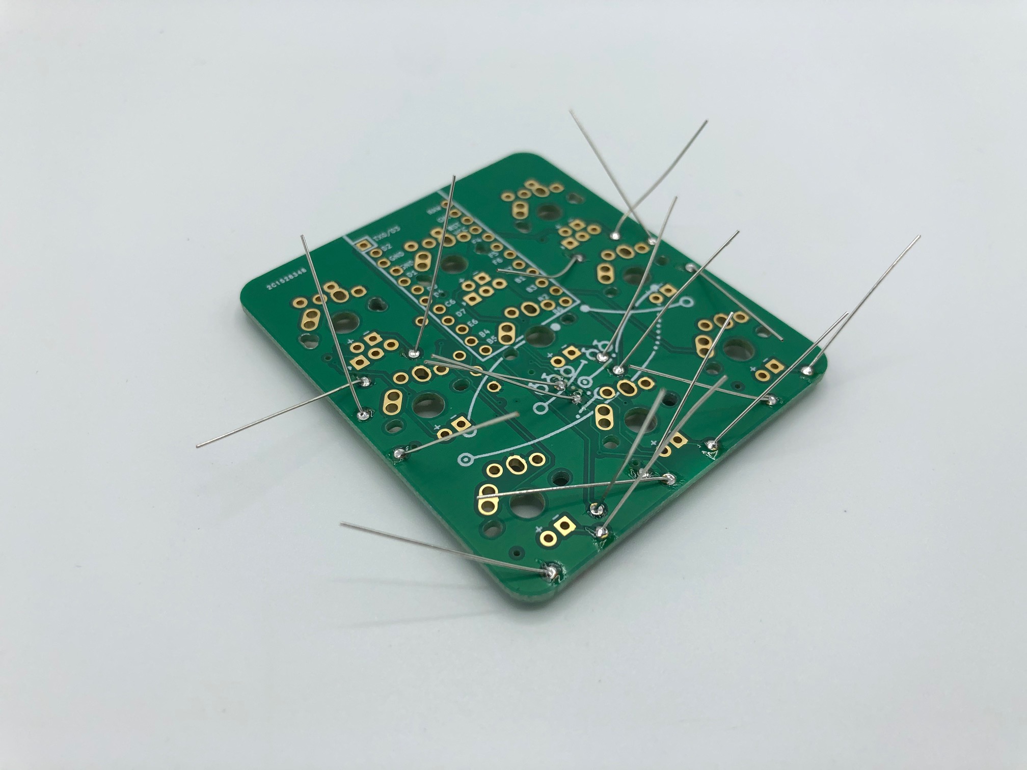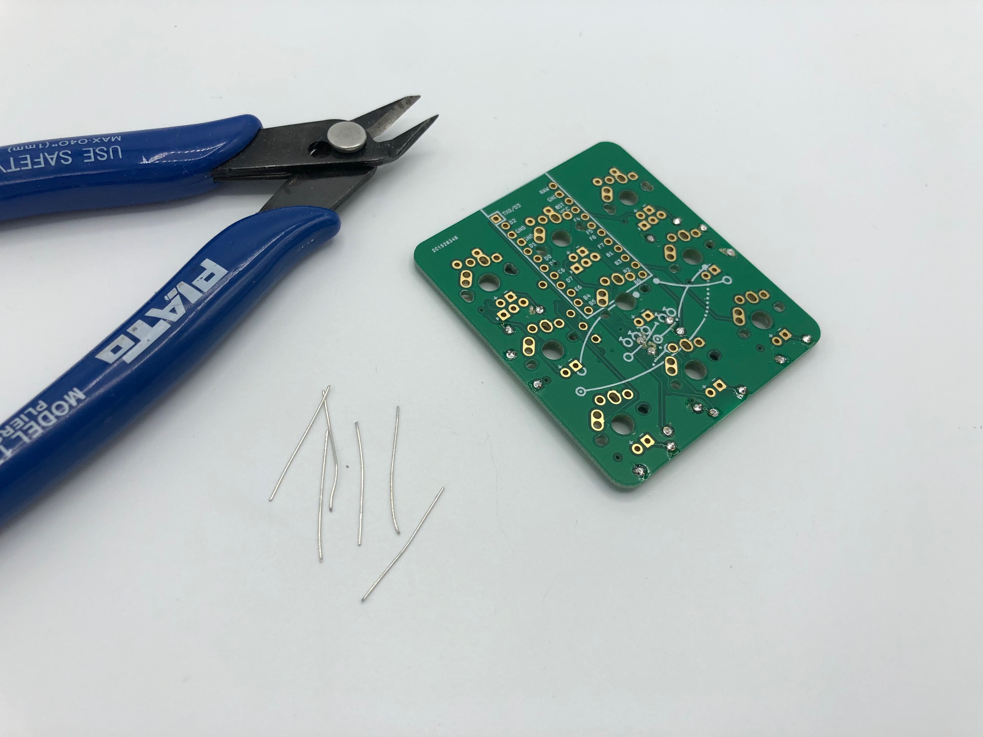 When using Choc low-profile switches, there is very little clearance between the switch plate and the top of the PCB. Any exposed metal/solder can cause a short if it touches the switch plate, so before you add the switches to the plate and solder them to the PCB, it's advised that you double check that all solder joints on the top of the PCB are cut flush. Alternatively, you can add Kapton tape to any that are raised. It doesn't hurt to add Kapton tape to the encoder legs as well.