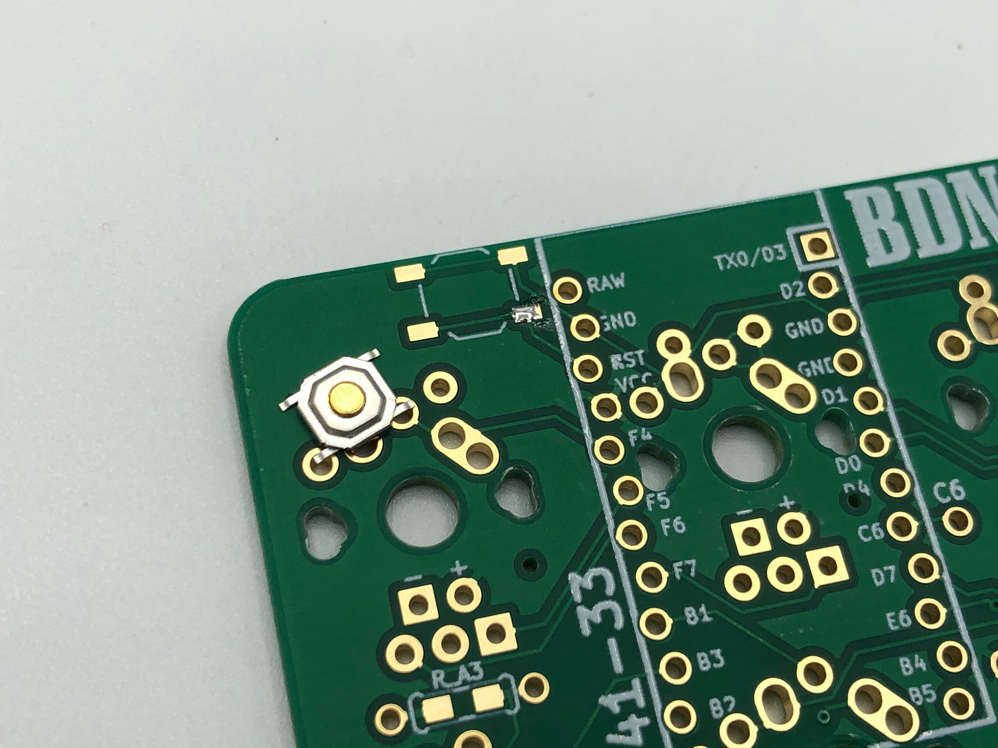 Add the reset button to the bottom side of the PCB and solder the first leg.