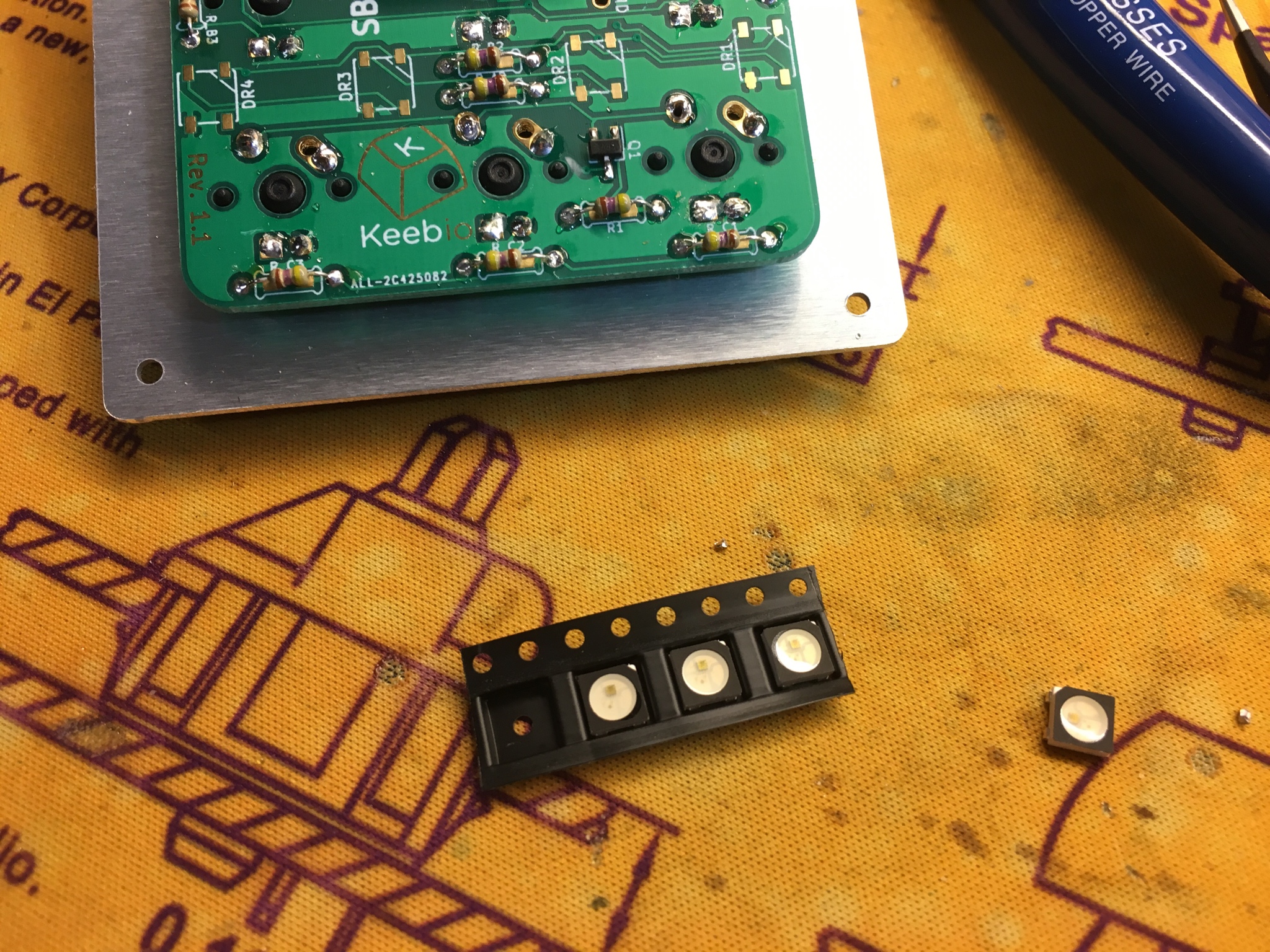Using a pair of tweezers, hold each LED in place and solder it in.