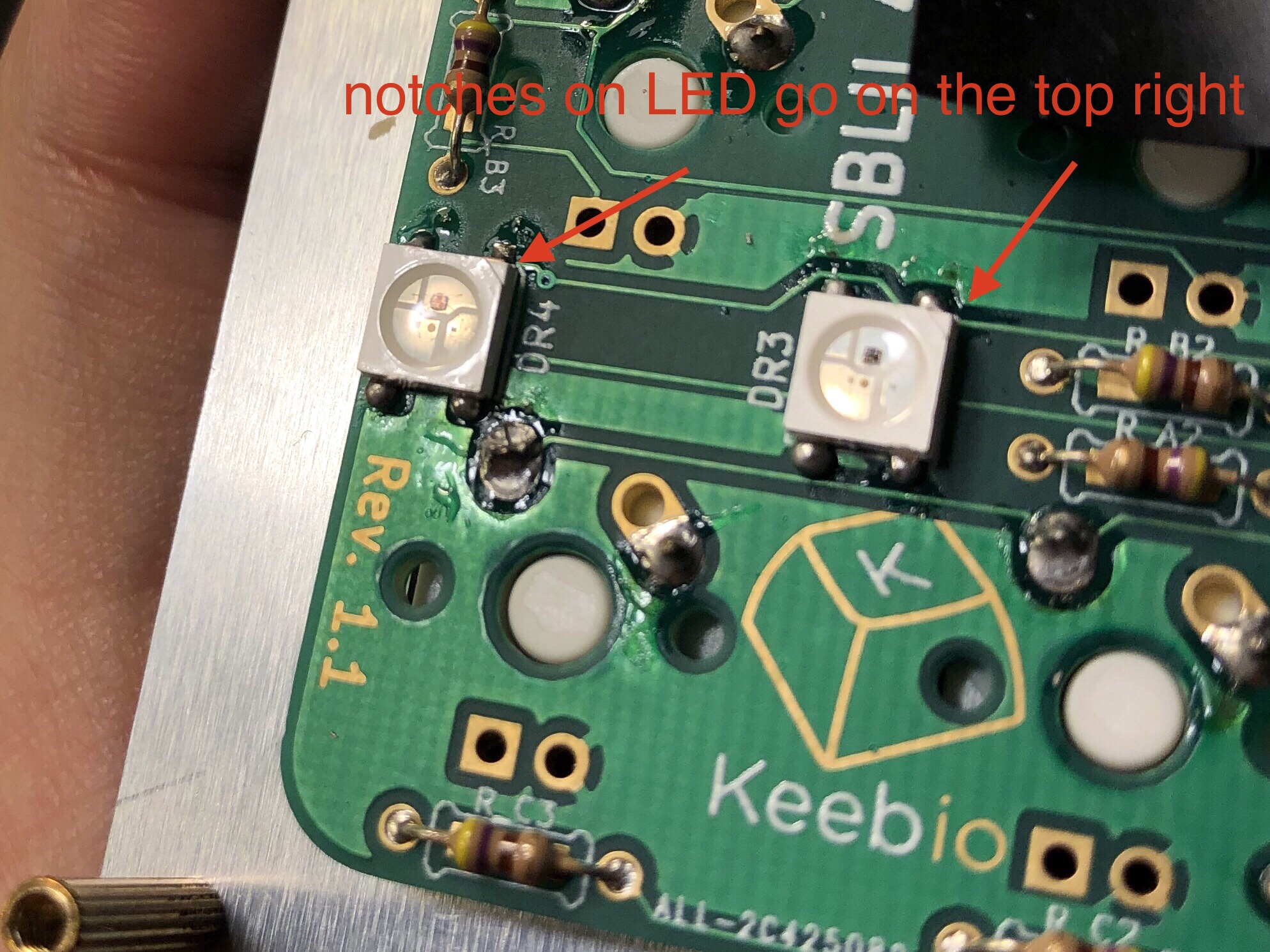 Note: Before soldering ensure each LED is properly aligned, with the corner notch on the top-right pad.