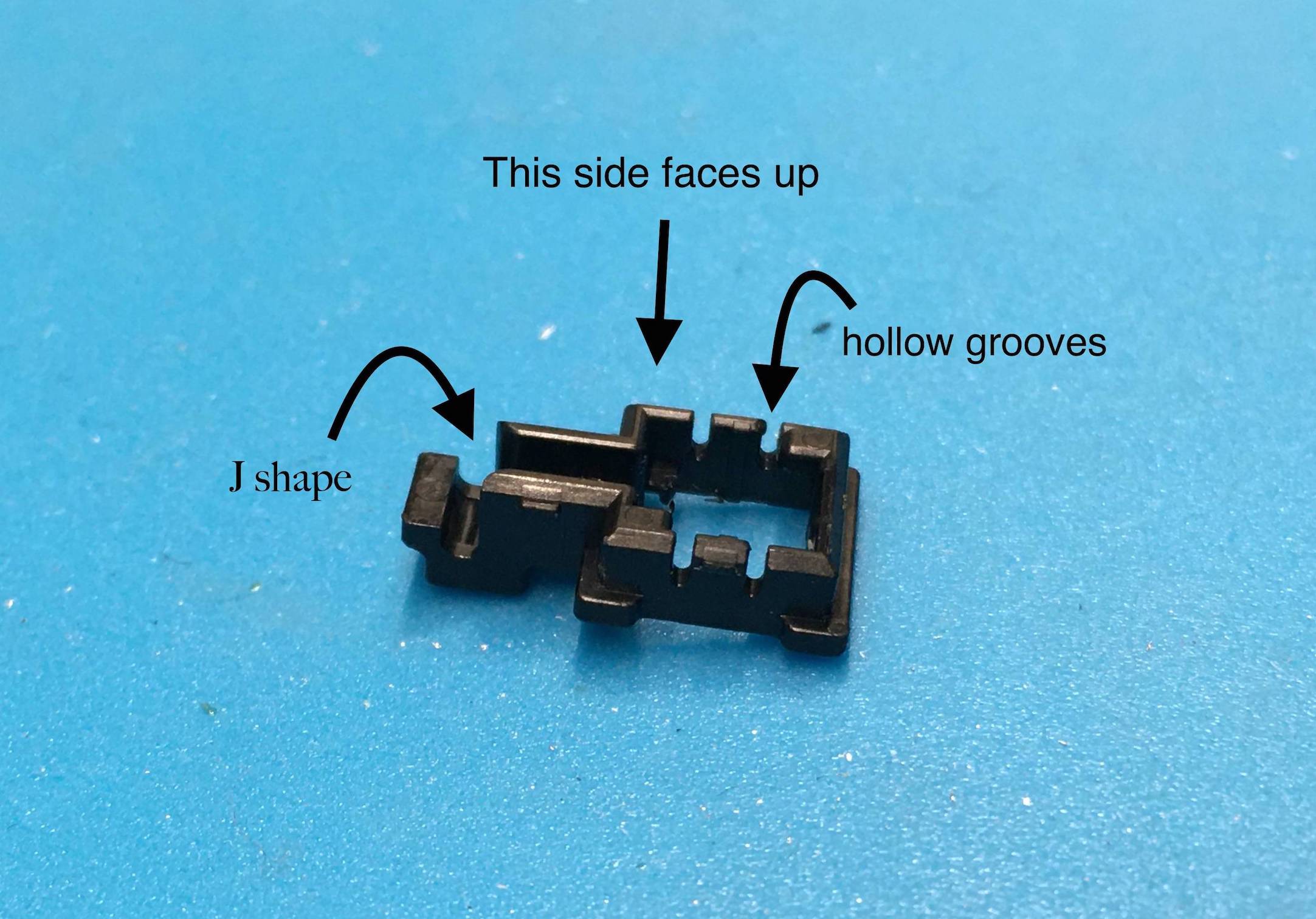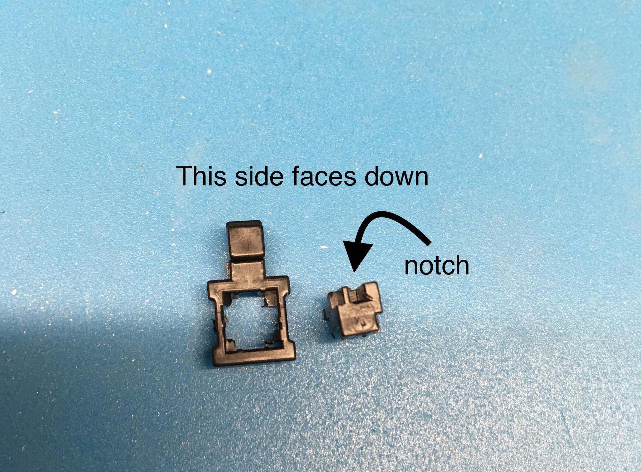 The bigger piece that looks like a box with an extruded bit is going to be visible on both sides. The part you want to have facing up is the part that has 4 hollowed out grooves on its edge. The other side will not have these grooves and will be facing down toward your PCB.