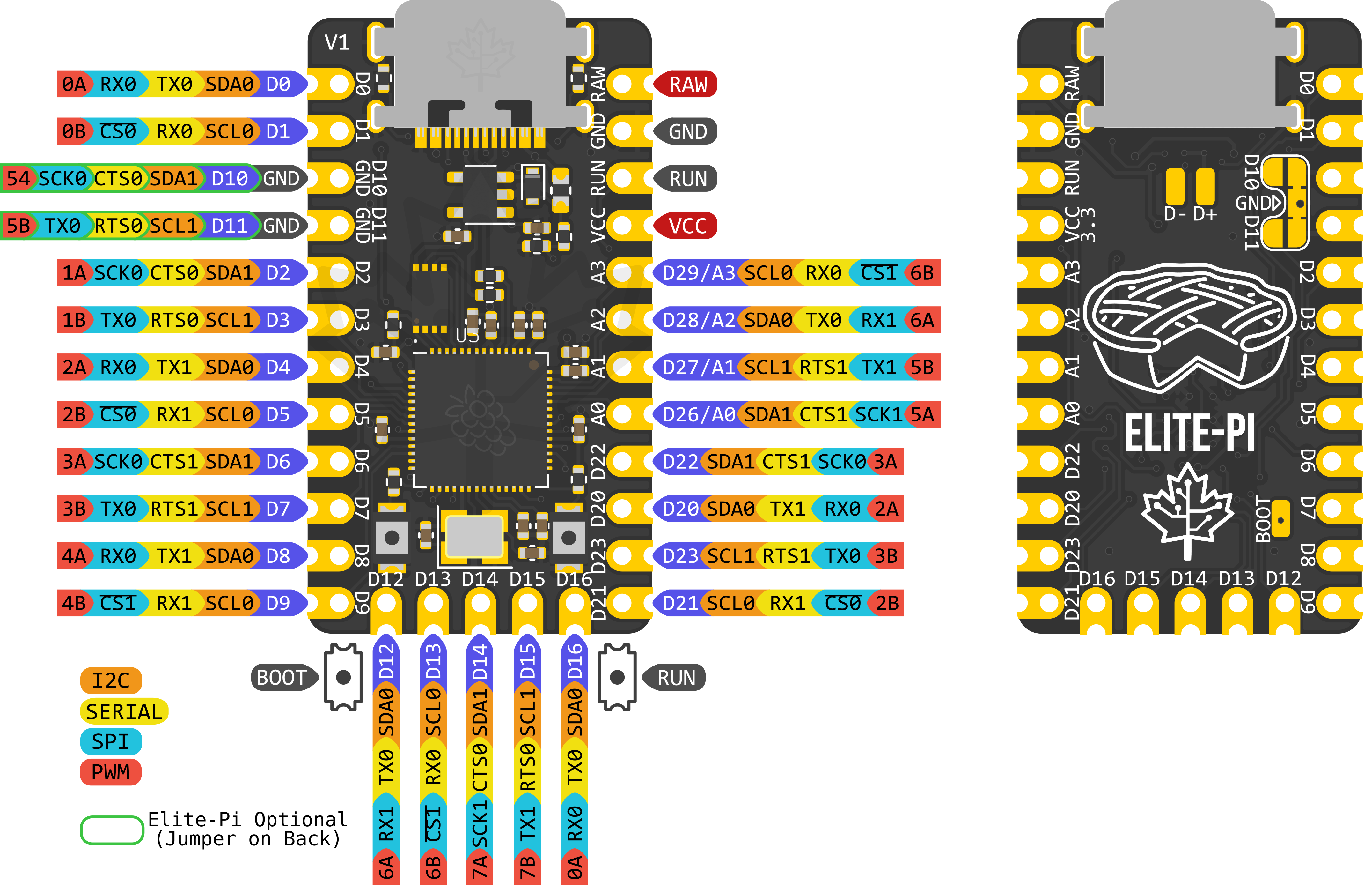 At the moment with V1 of the Elite-Pi, there are two buttons on it for Run/Reset and Boot, unlike the Elite-C, where there is only one button needed for Reset. The left button is for Boot, and the right button is for Run. You will mainly be interested in getting the Elite-Pi into bootloader mode, so please see the directions below for doing this.