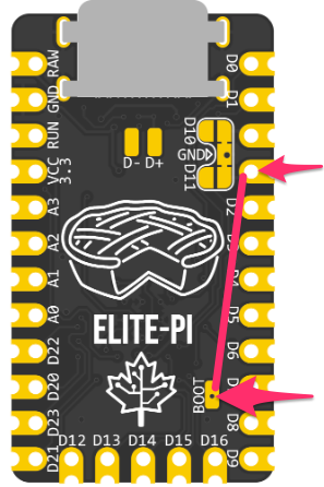If you have the Elite-Pi installed with the back facing towards you, and you need to press Boot, take a wire and connect the Boot pad on the back and a GND pad, as shown below:
