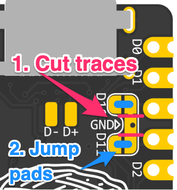 If you would like to access D10 and/or D11 via the pads on the side of the Elite-Pi, you will need to cut the traces connecting GND to the those pads, as by default, the side pads are connected to GND to match the normal Pro Micro pinout. After cutting the traces, add solder as shown below to jump D10/D11.
