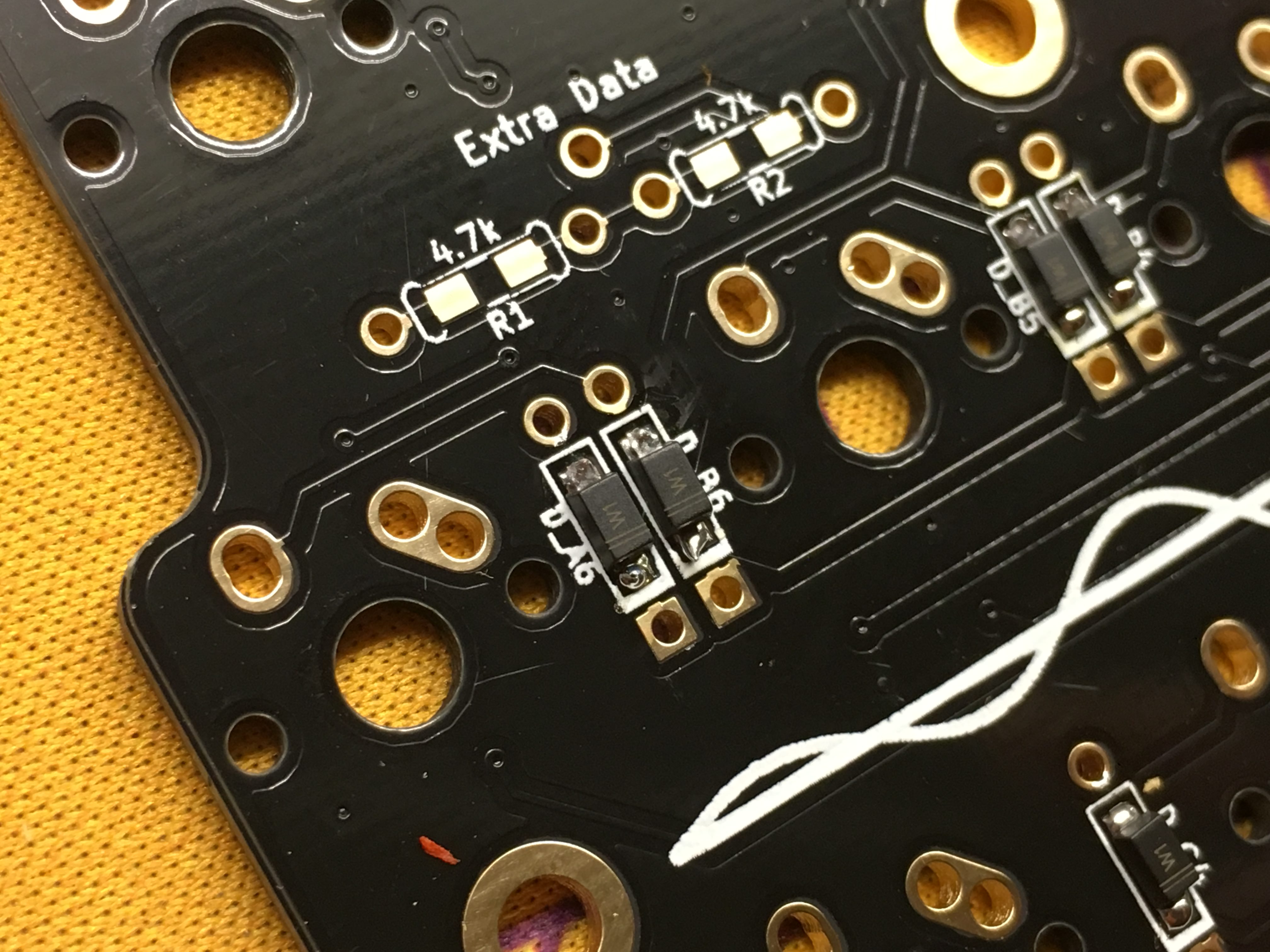 Repeat the same process with the diodes, TRRS jack, and reset switch with the right half. Note that there's no I2C resistor slots on this side, as they're only needed on one half.