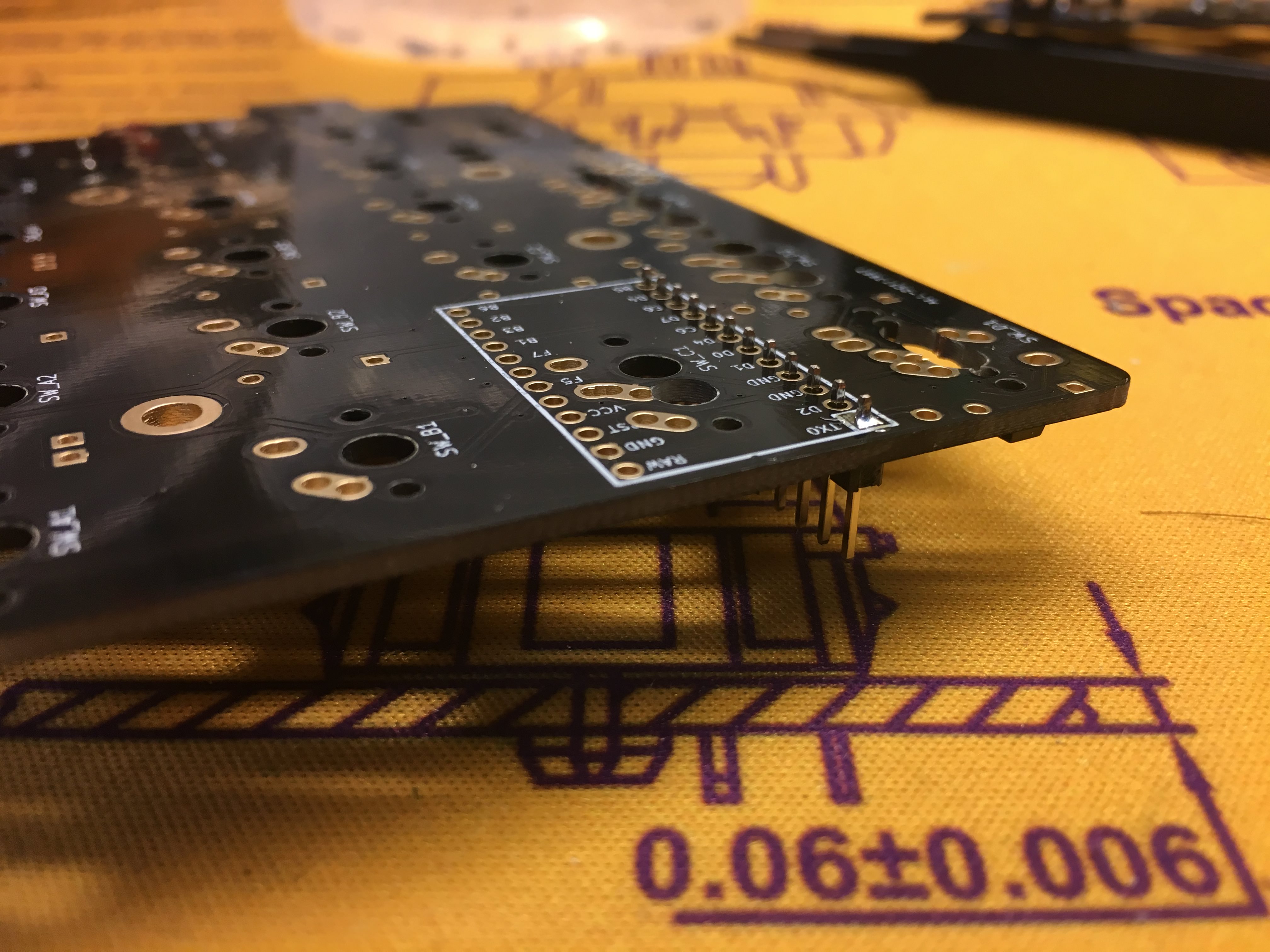 Due to the location of the stabilizers on the right half, the Pro Micro header pins needed to be situated a bit lower than usual. This interferes a bit with one of the switches, so the pins need to be trimmed down a bit on that side.