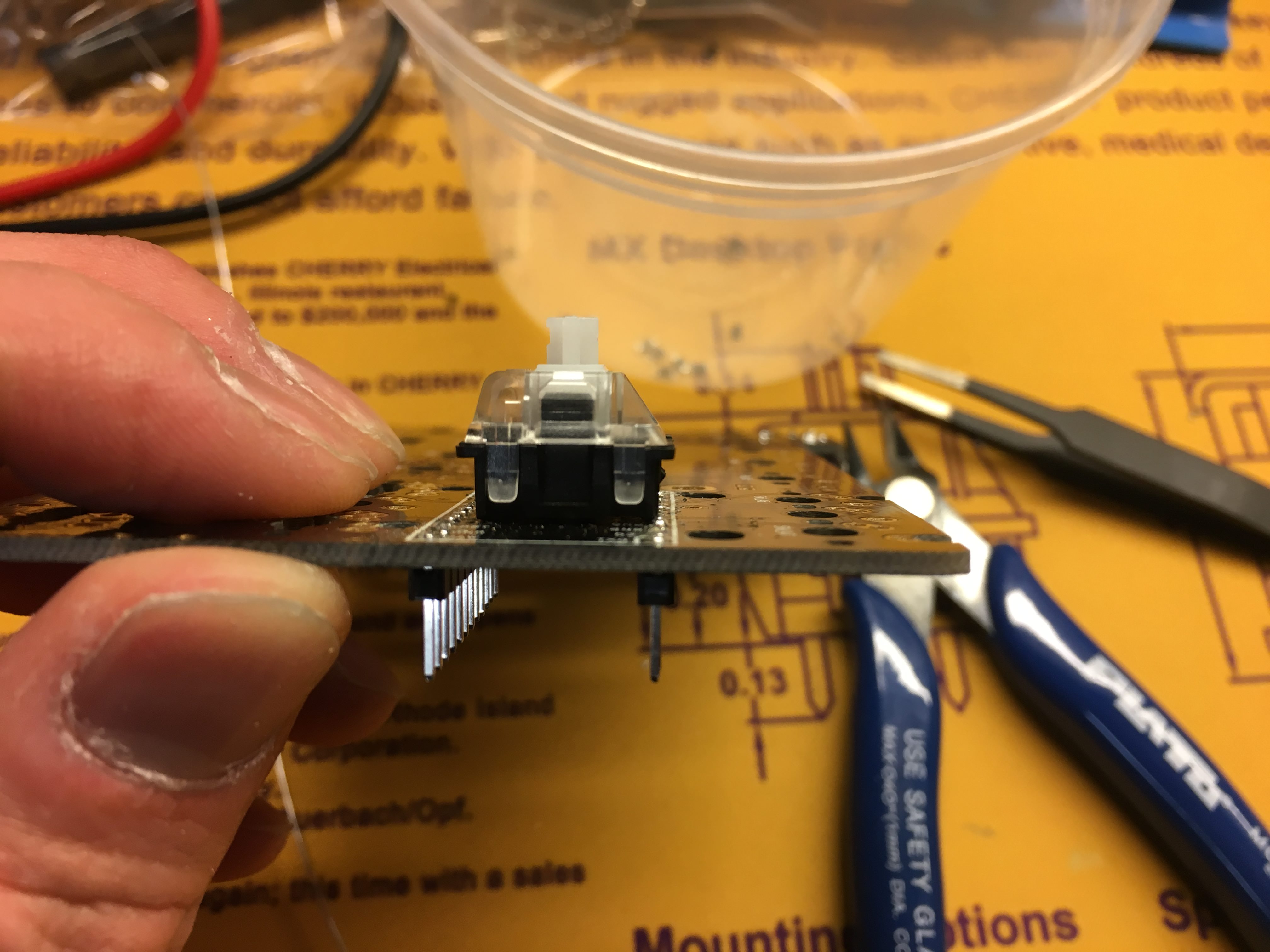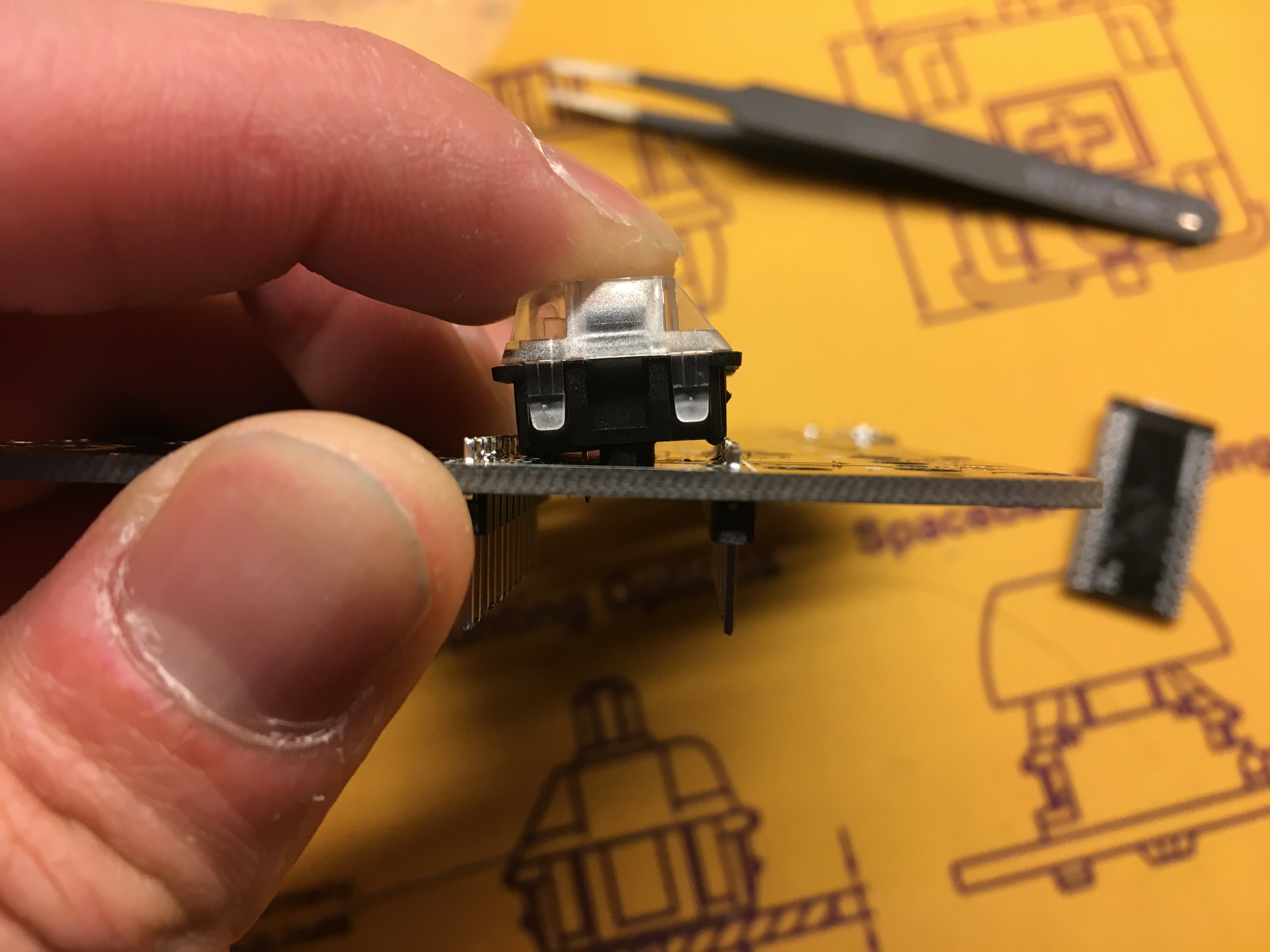 Time to add the switches. Put a few switches into the corners of the switch plate and then attach the switches to the PCB. Make sure the switches are pushed all the way down onto the PCB.
