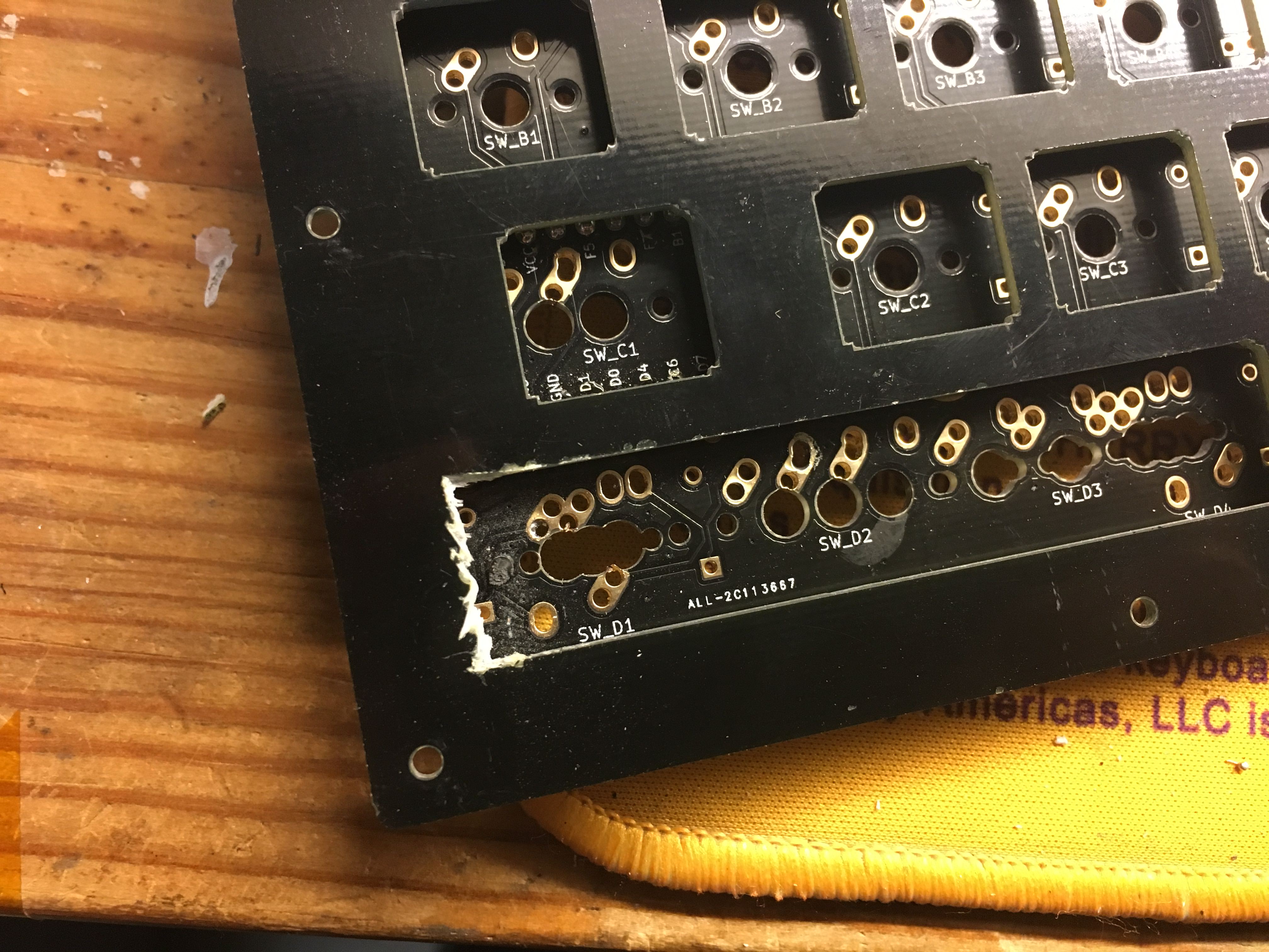 If you paid attention closely to the previous picture, the lower left switch was too close to the one to the right of it to properly do a 4x1u configuration on the bottom row. Turns out I forgot to expand the cutout width when I added support for that configuration. This has already been fixed in the next version of the plates.