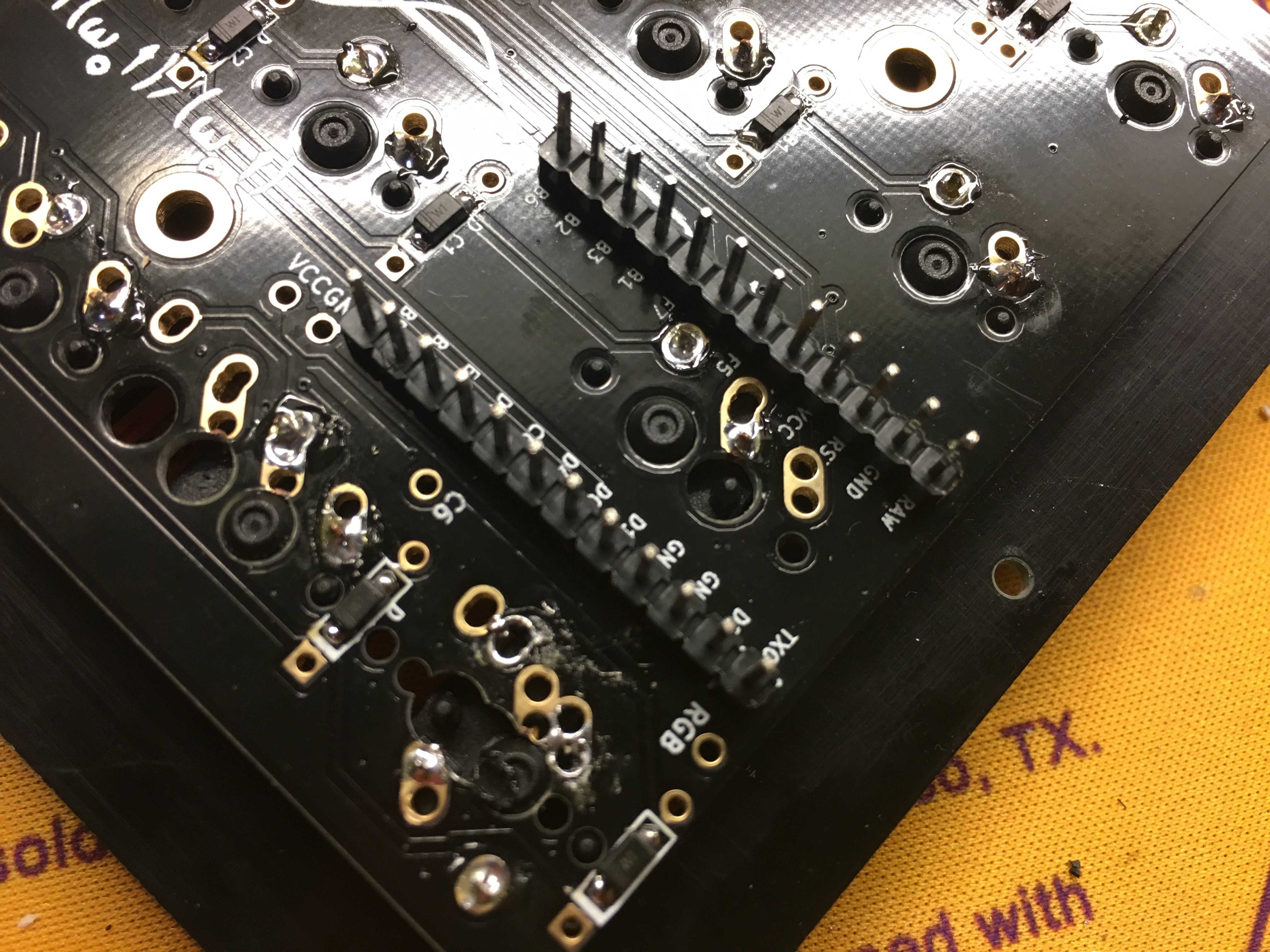 Place the Pro Micro on the header pins. On both PCBs, the component side of the Pro Micro will be hidden from you.