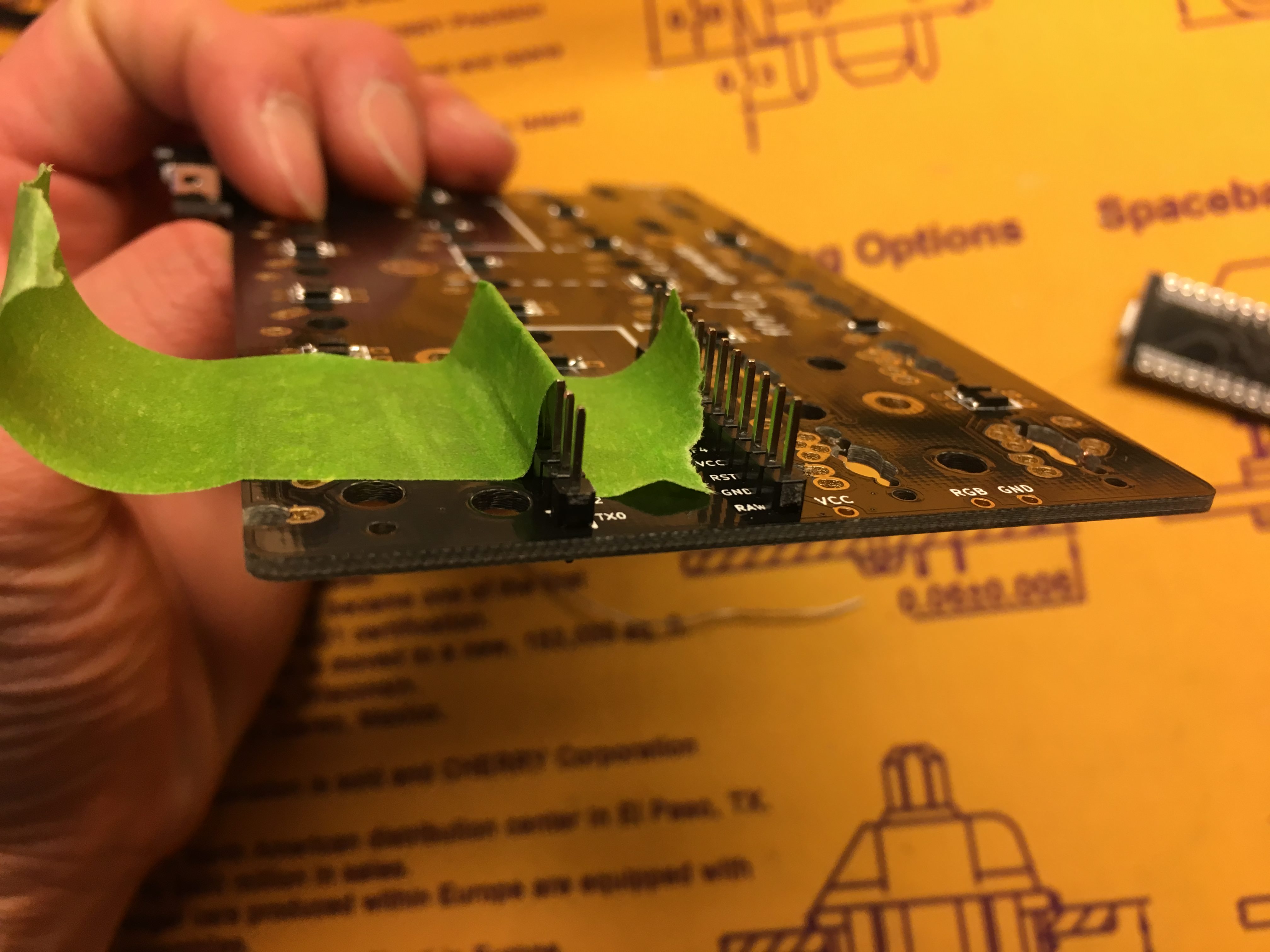 Second technique for soldering header pins on: Tape row of pins so they stay in place while you solder them in.