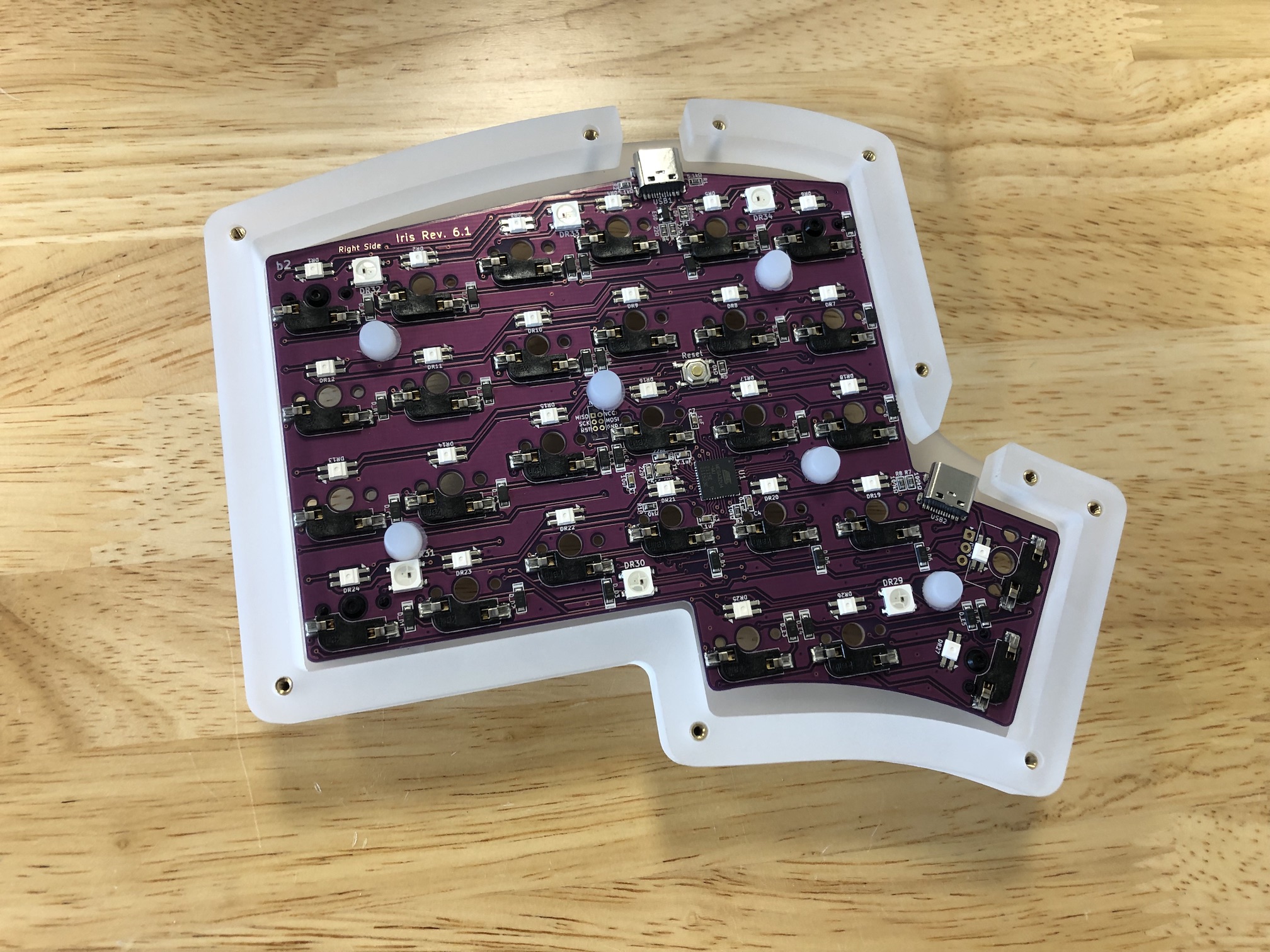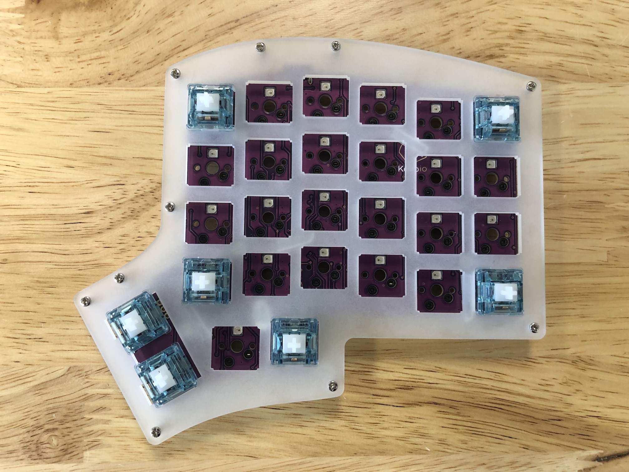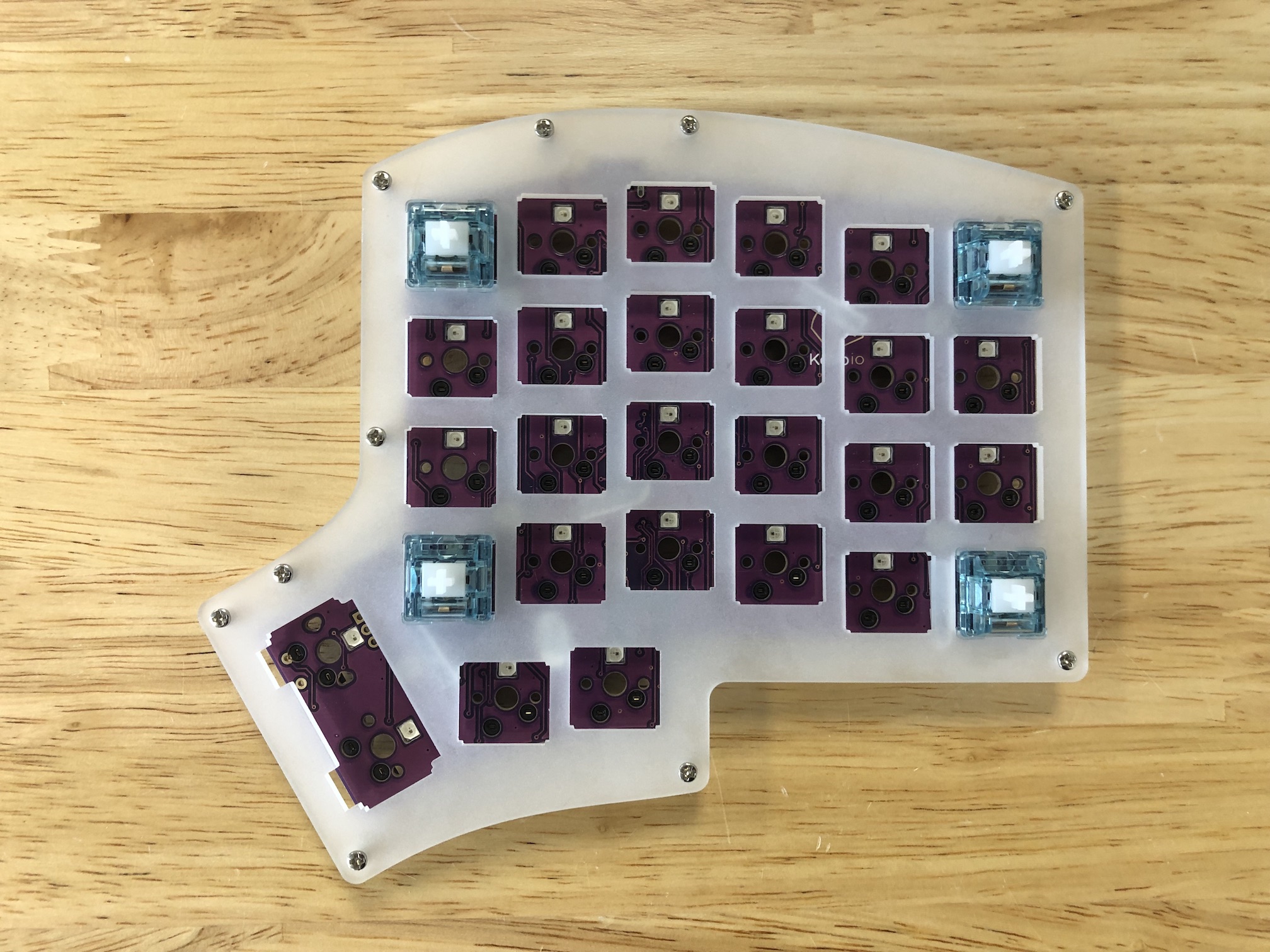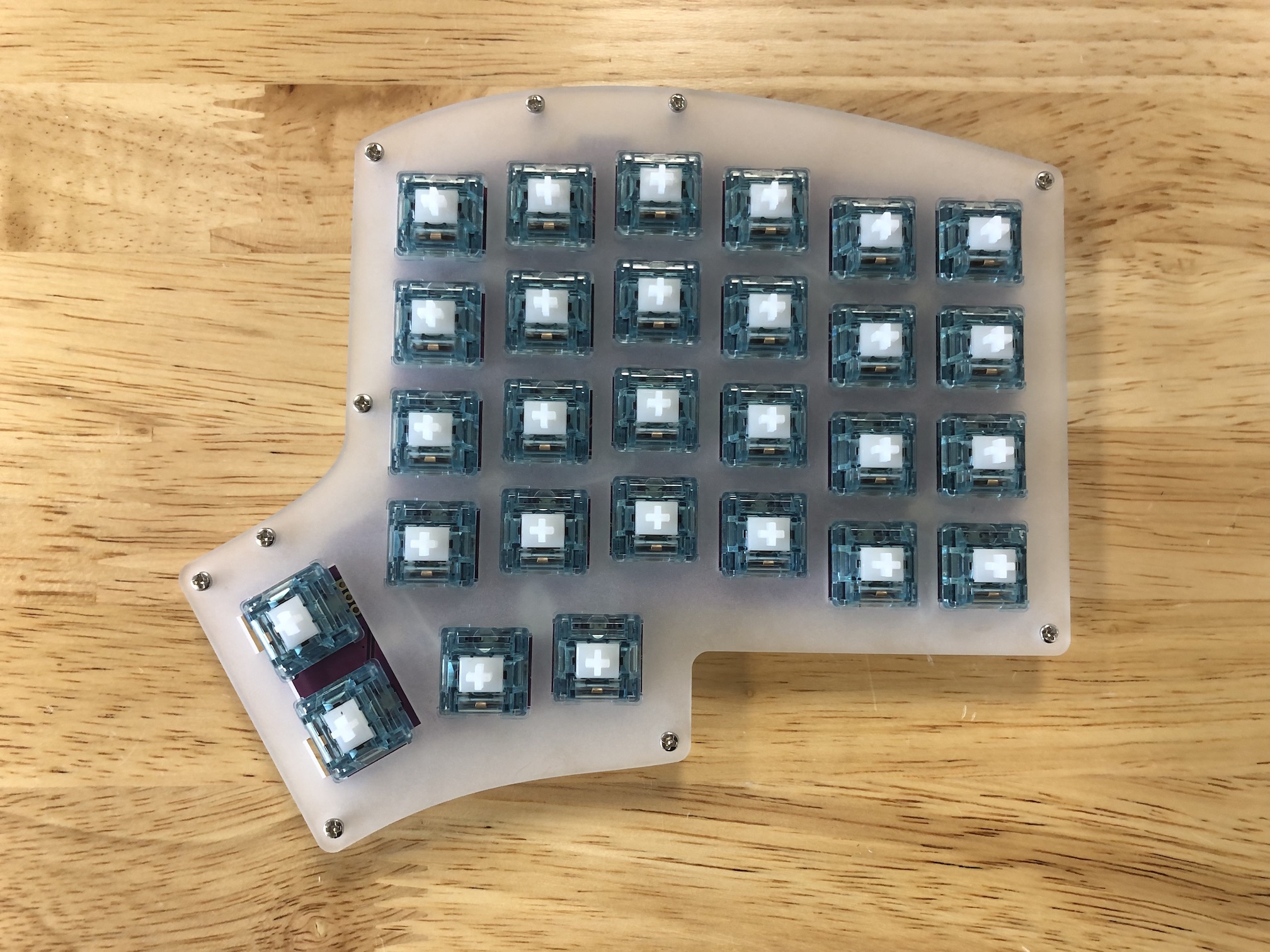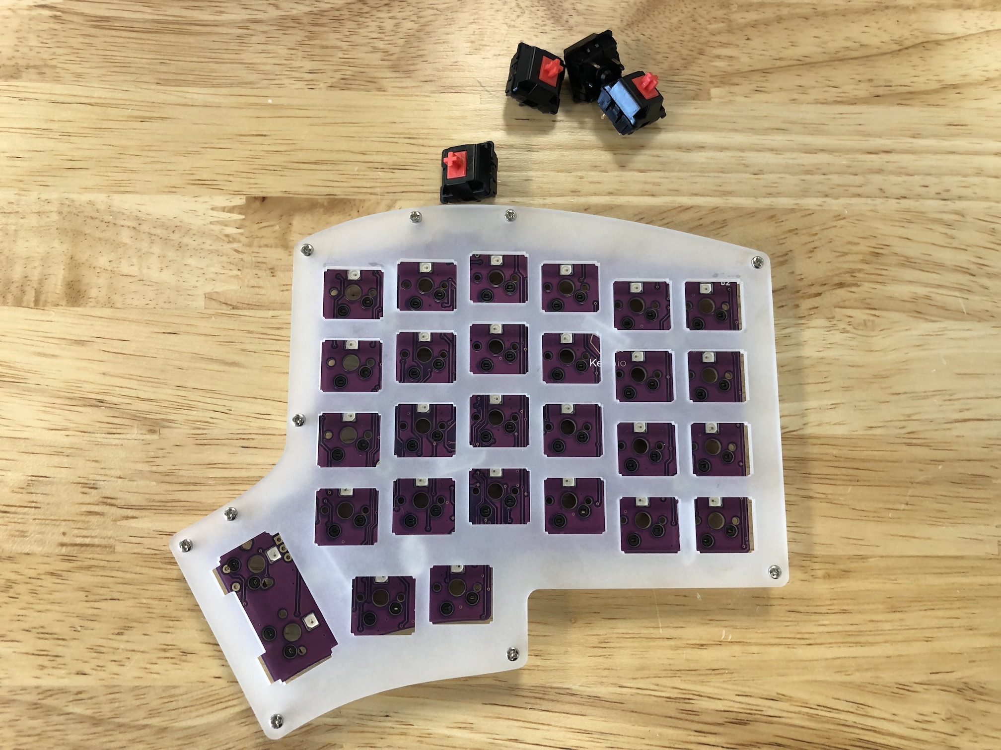 After you've installed the first few switches successfully, insert the ones for the thumb area in to make sure they'll fit in properly. As before, make sure you are supporting the the bottom of the socket while pressing the switches in.