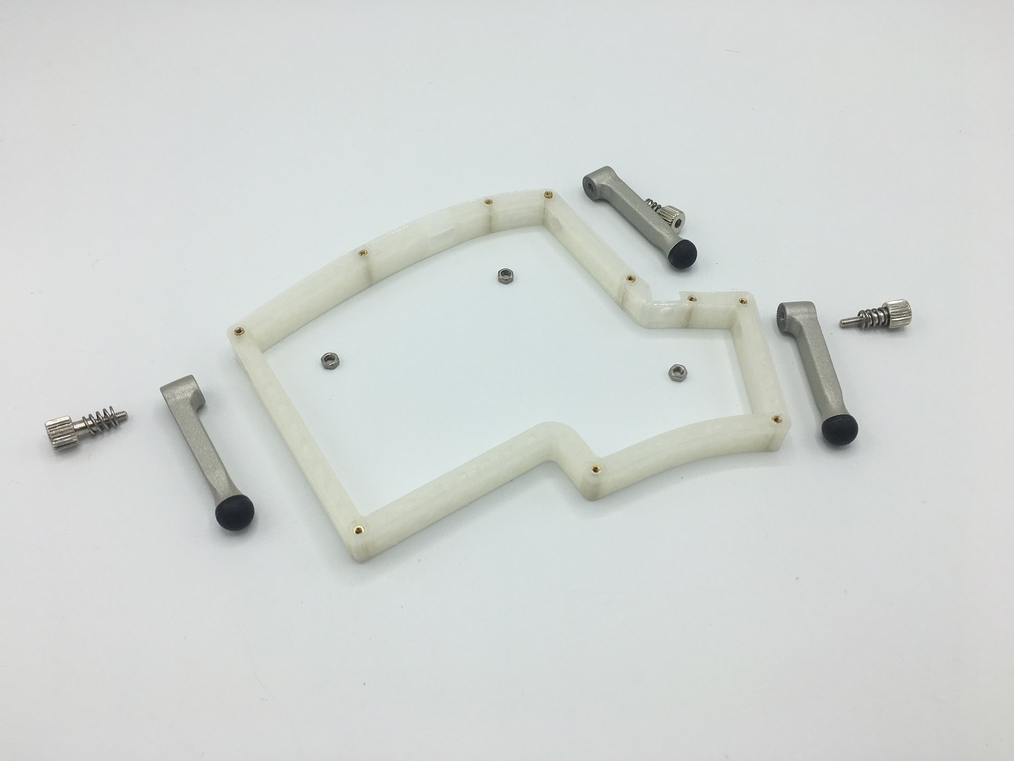Put the spring over the thumbscrew and then insert them through the leg. Afterwards screw it into the nut and tighten.