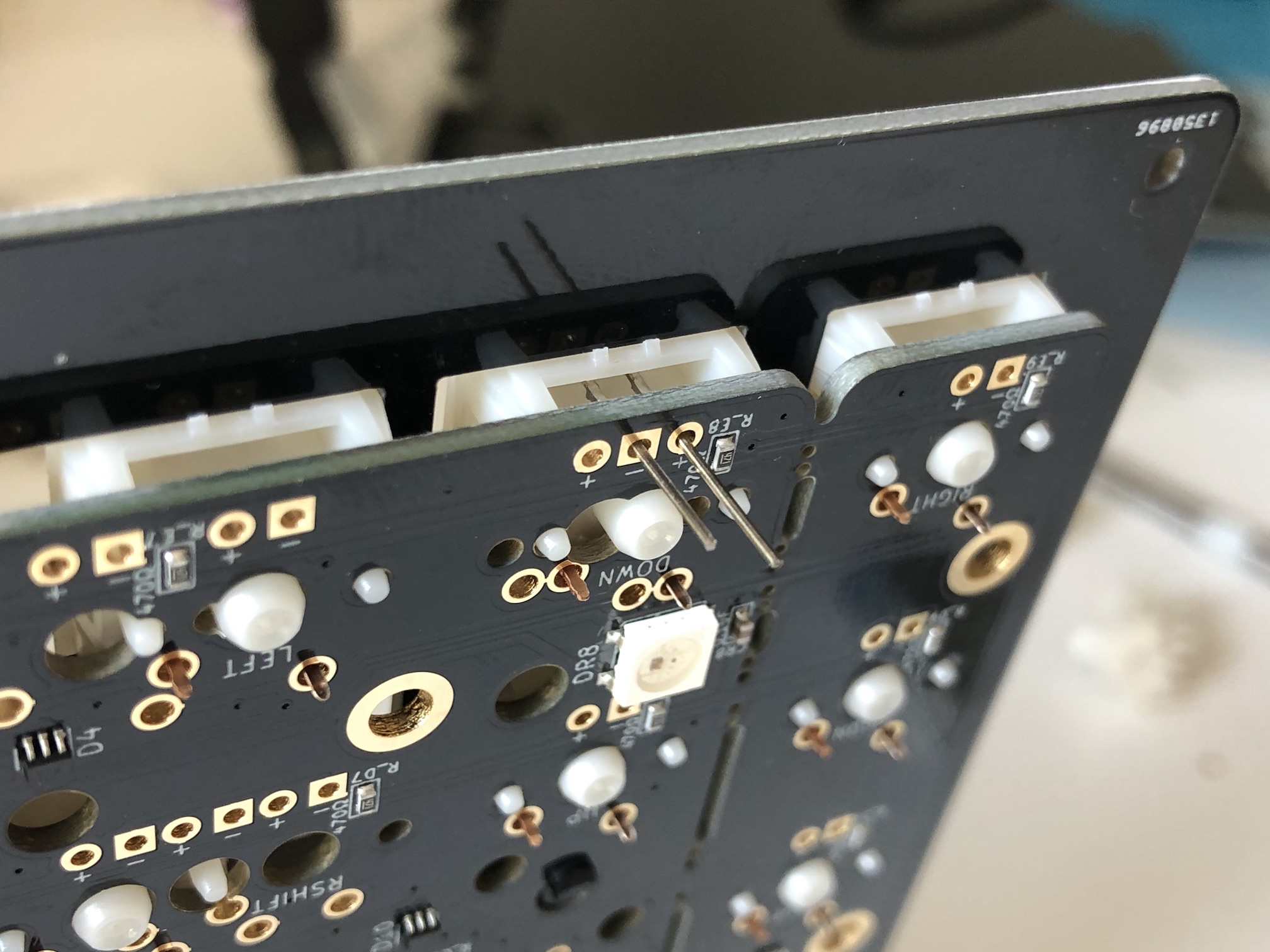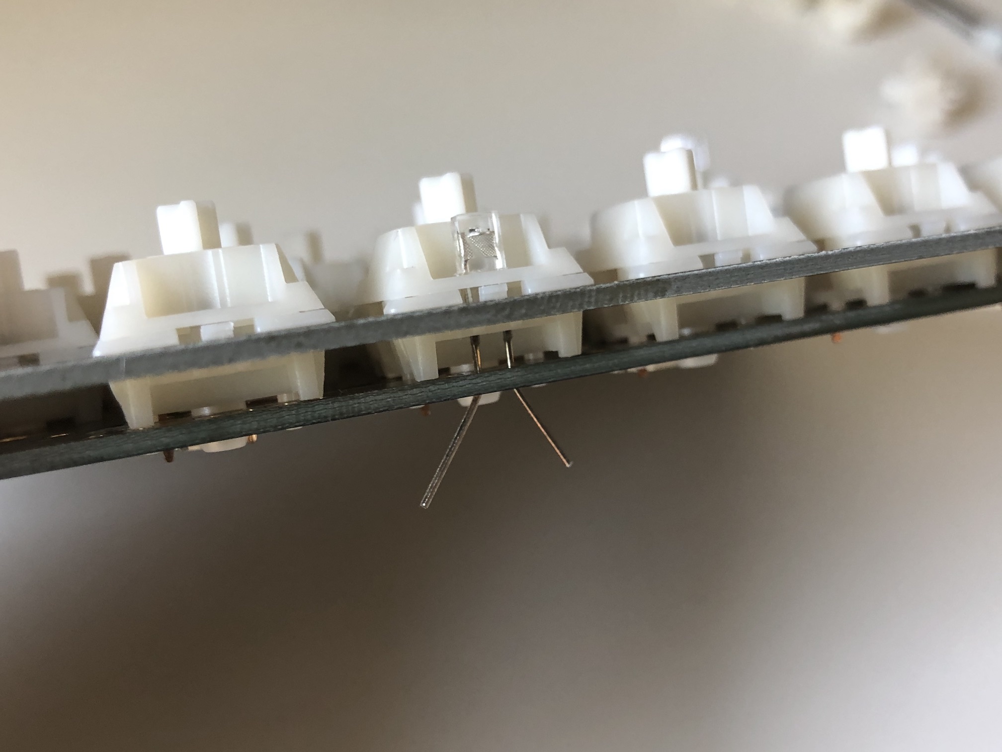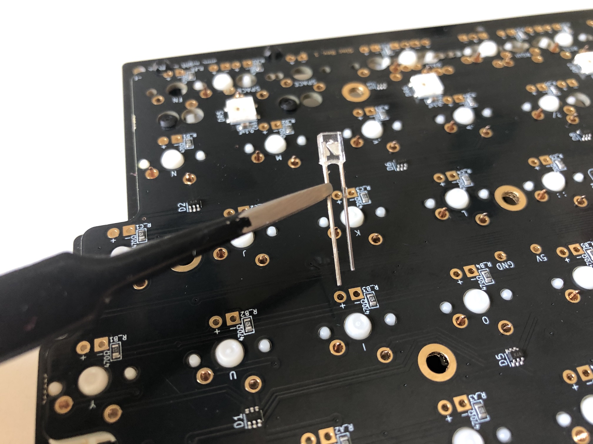 Note that some of the switch layout options have the -/+ markings swapped, so make sure to always put the longer leg through the + pad. If you are unsure, plug the PCB in and test the LED before soldering it in.
