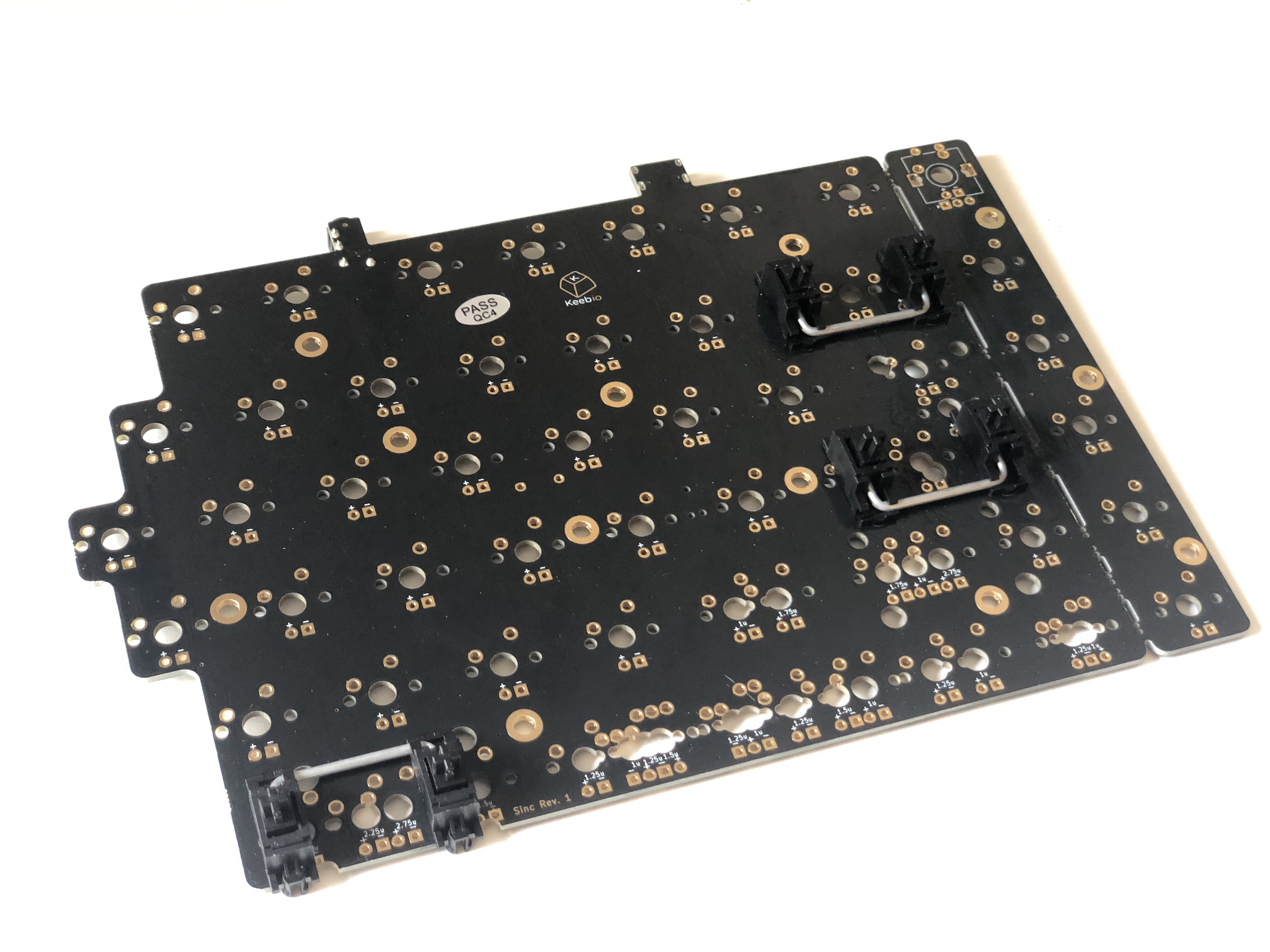 Add the 2u stabilizers into the PCB. The stab wire will be on the bottom side of the switch for everywhere except for the bottom row. On the bottom row, the stab wire will be above the switch. Do this before installing the switch plate and switches, as stabilizers can not be removed after the switches have been soldered in.