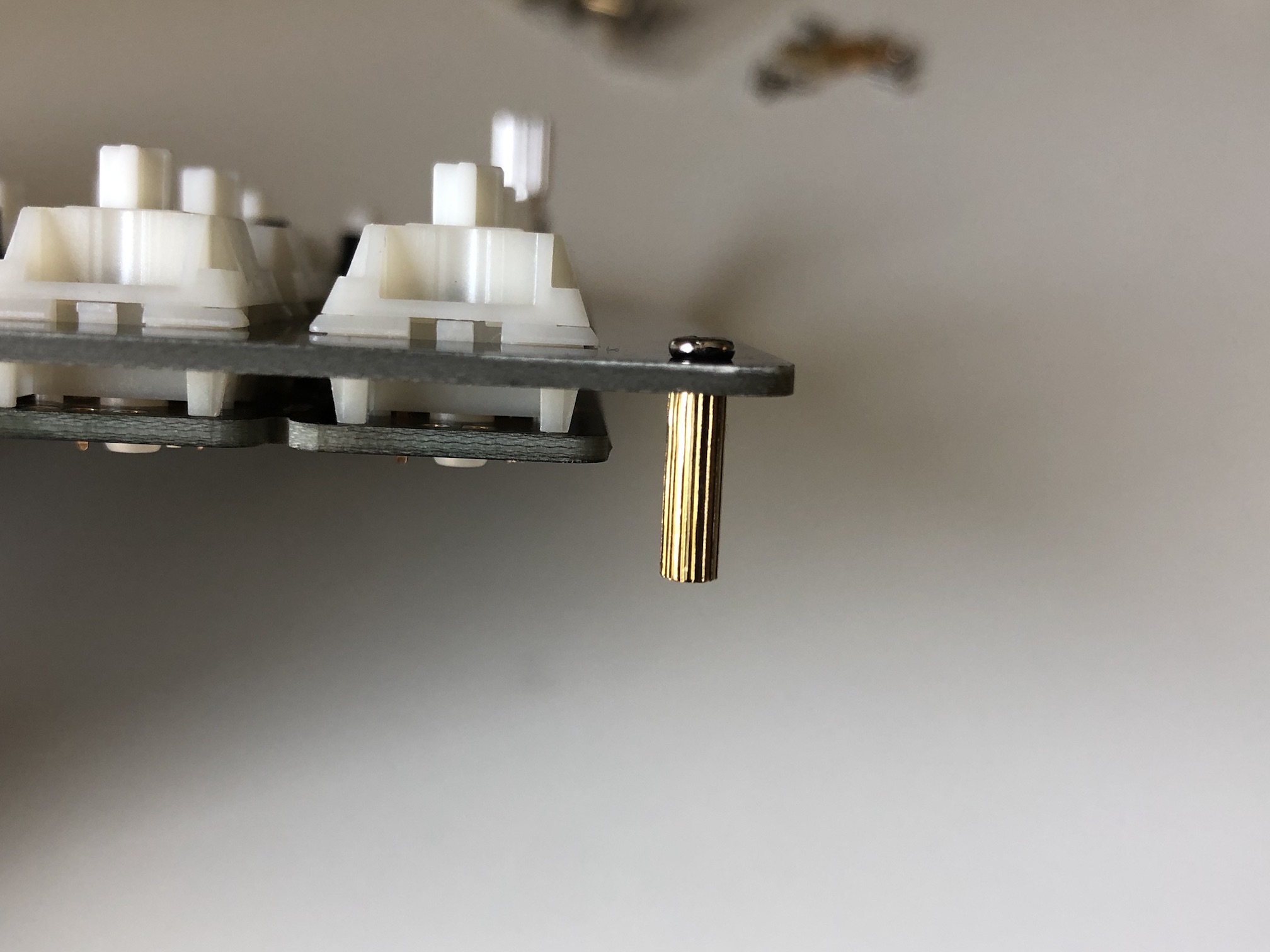 Insert a screw through the top of the switch plate and attach a standoff from the bottom side of the plate: