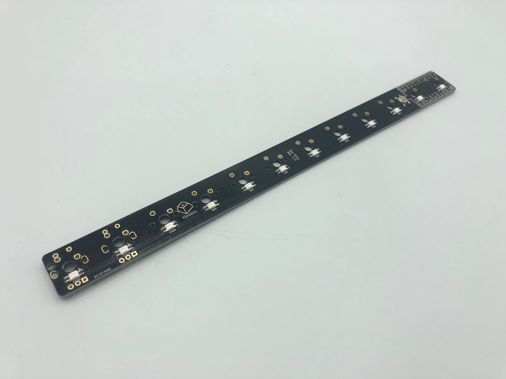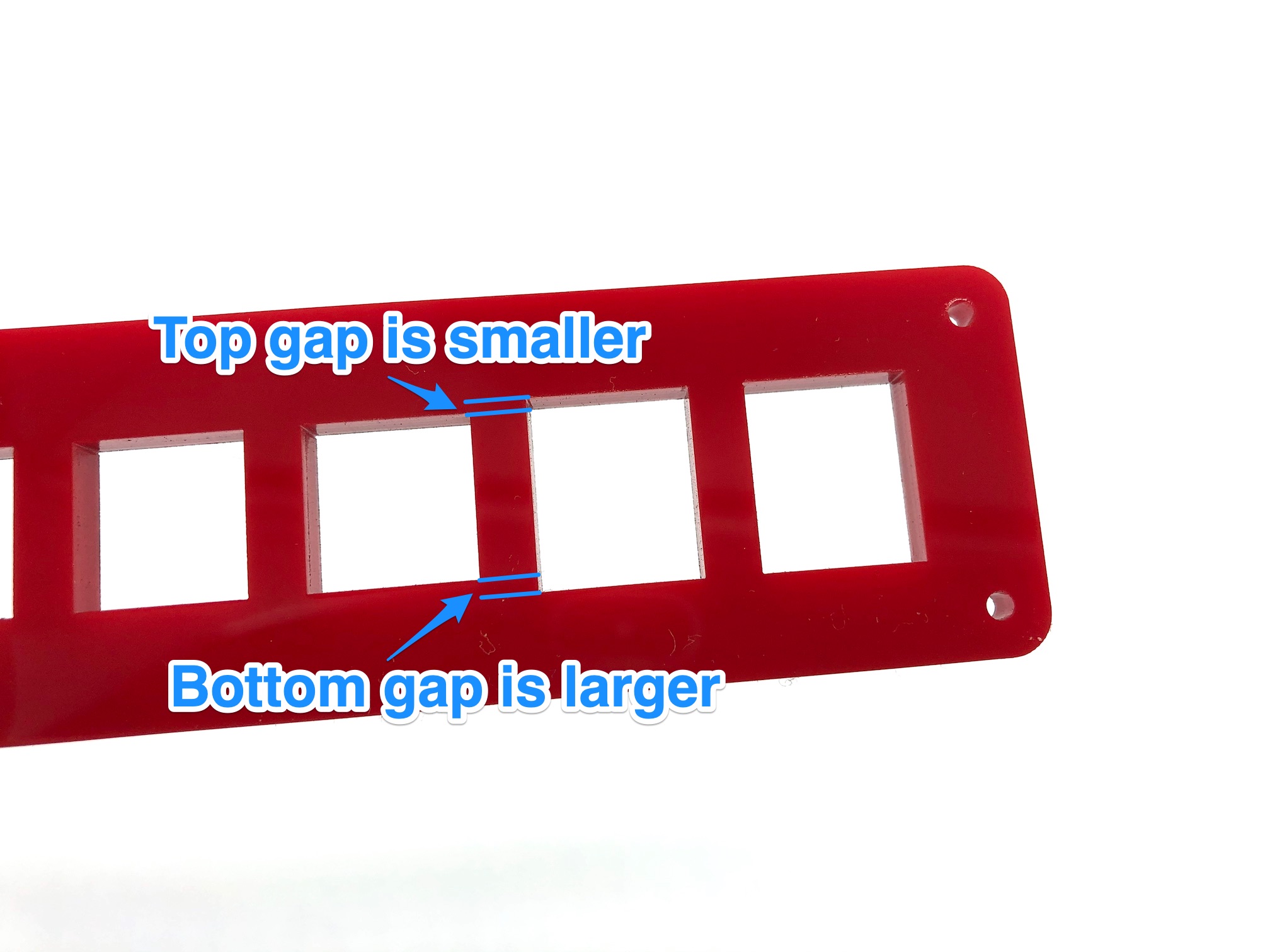 The orientation of the switch plate is important if you are going to be installing rotary encoders! In order for the encoders to not come in contact with the plate, make sure encoder cutouts are aligned as shown below. The encoder cutout is larger than the switch cutout at the top by 1mm and larger at the bottom by 1.5mm. If you are not careful, then the 3 bottom encoder pins may come in contact with the plate and be harder to install.