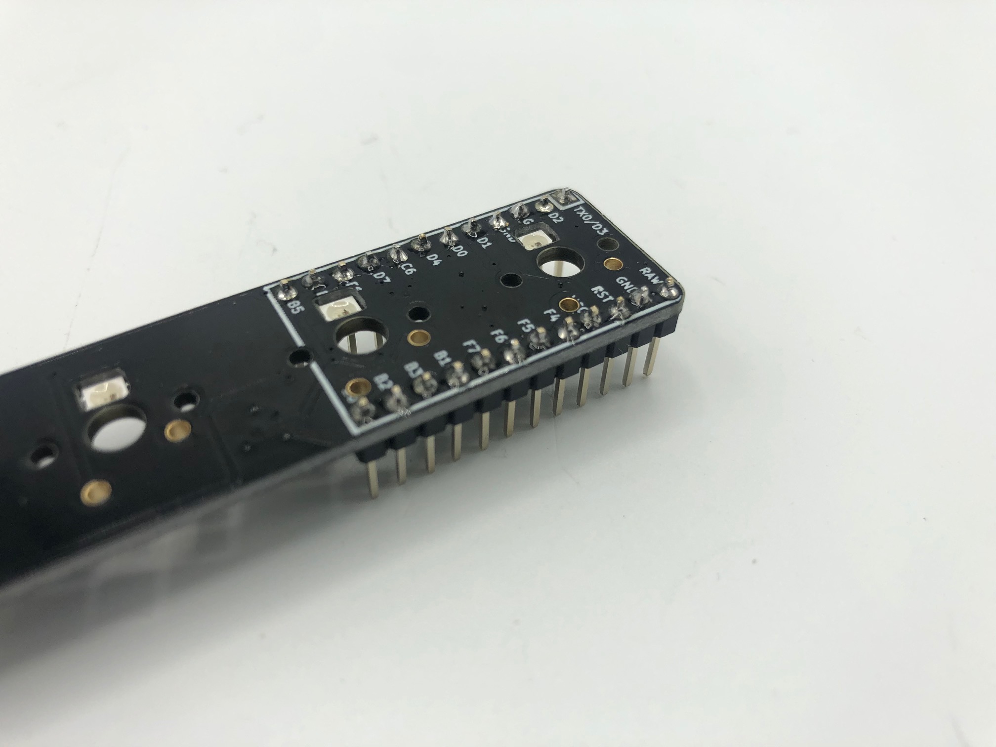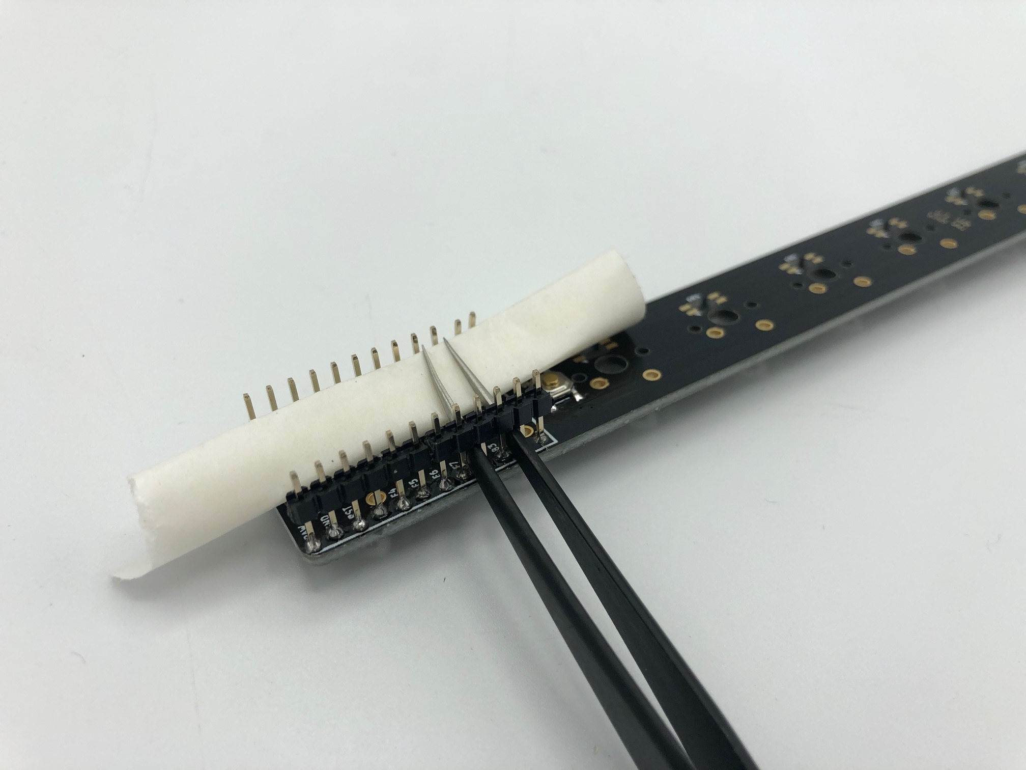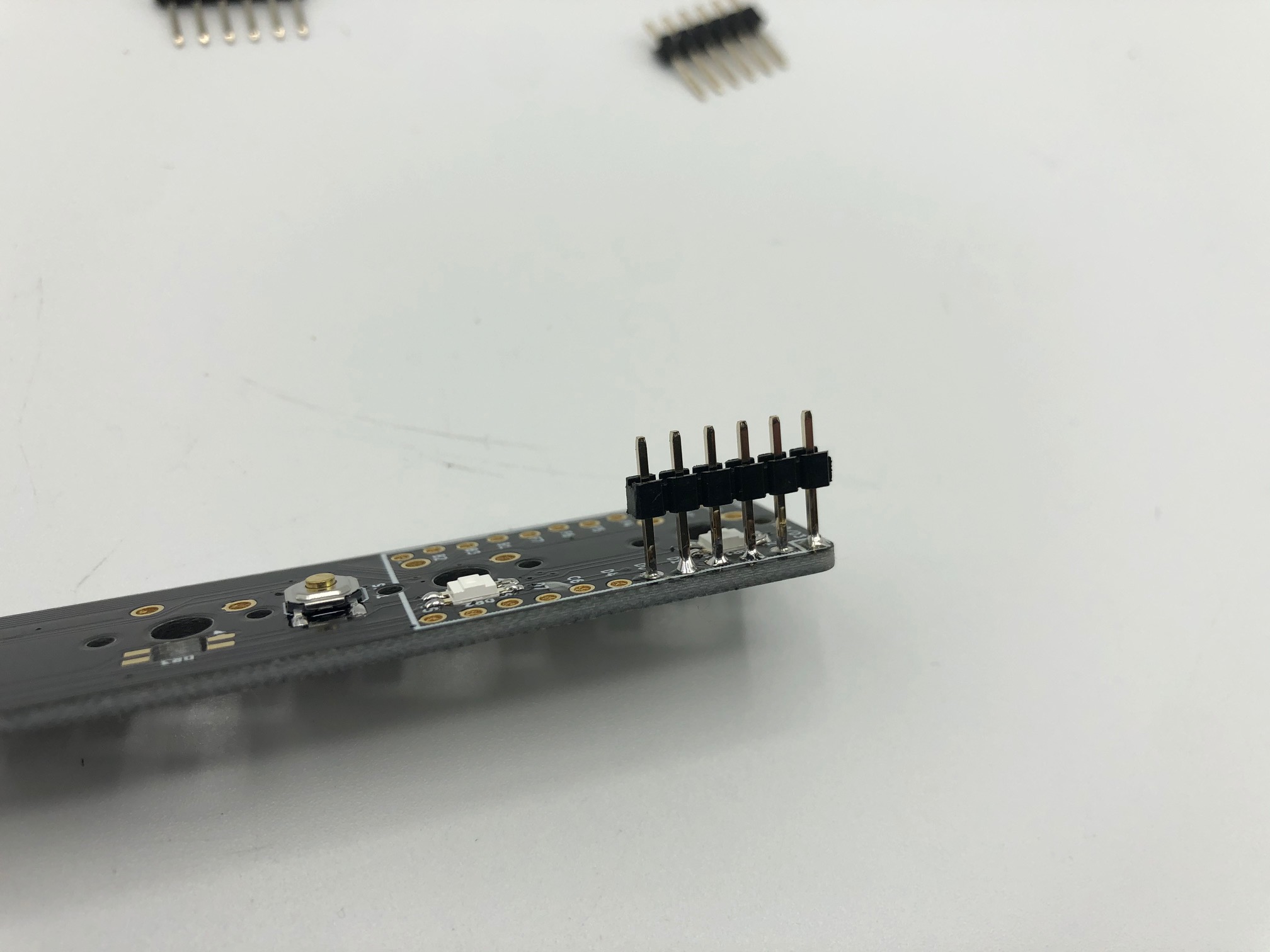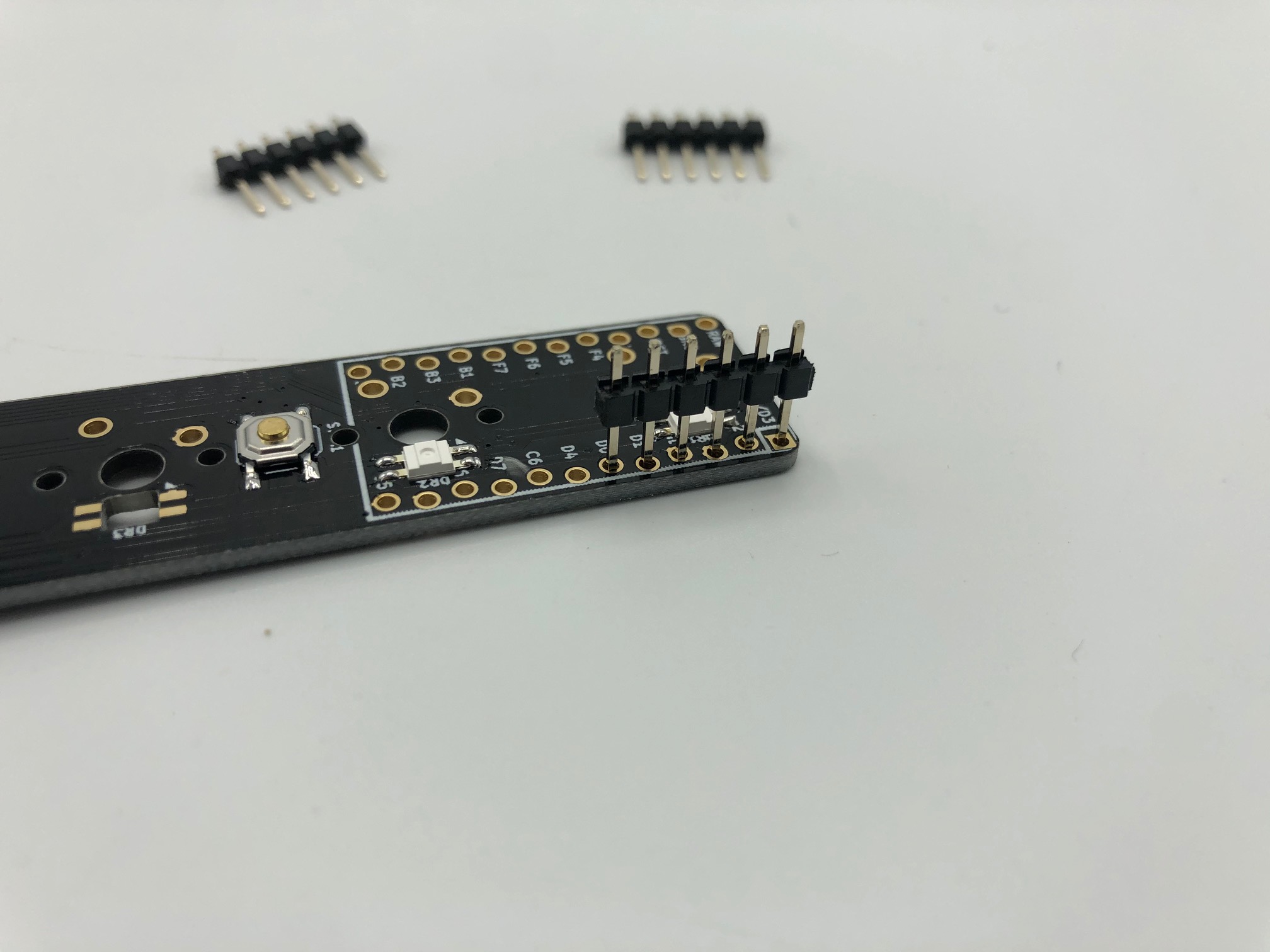 Insert the 6-pin header upside-down in the Pro Micro slot on the PCB. Make sure the PCB is flat on the table. The pins should be able to stand up on their own when inserted.