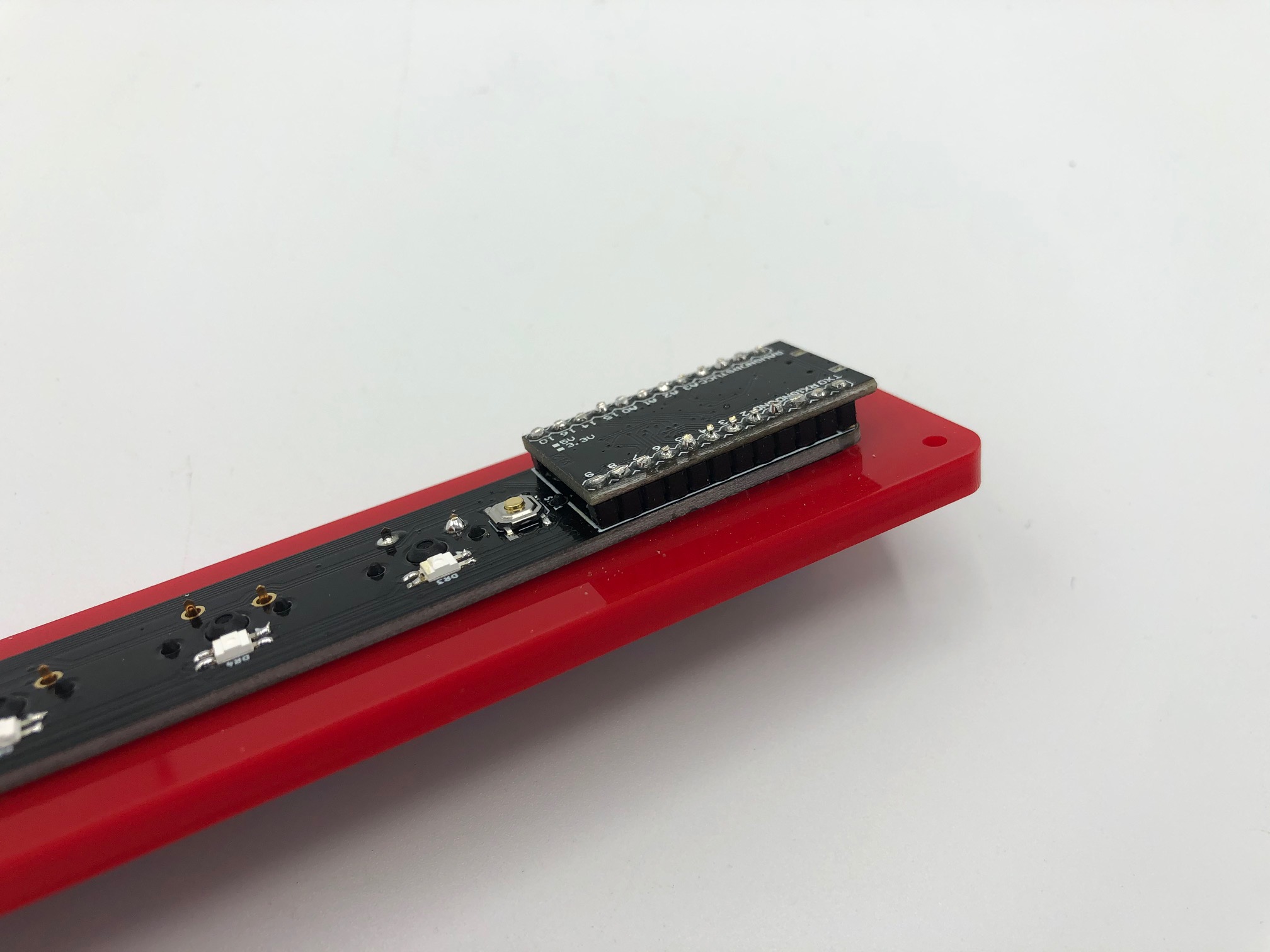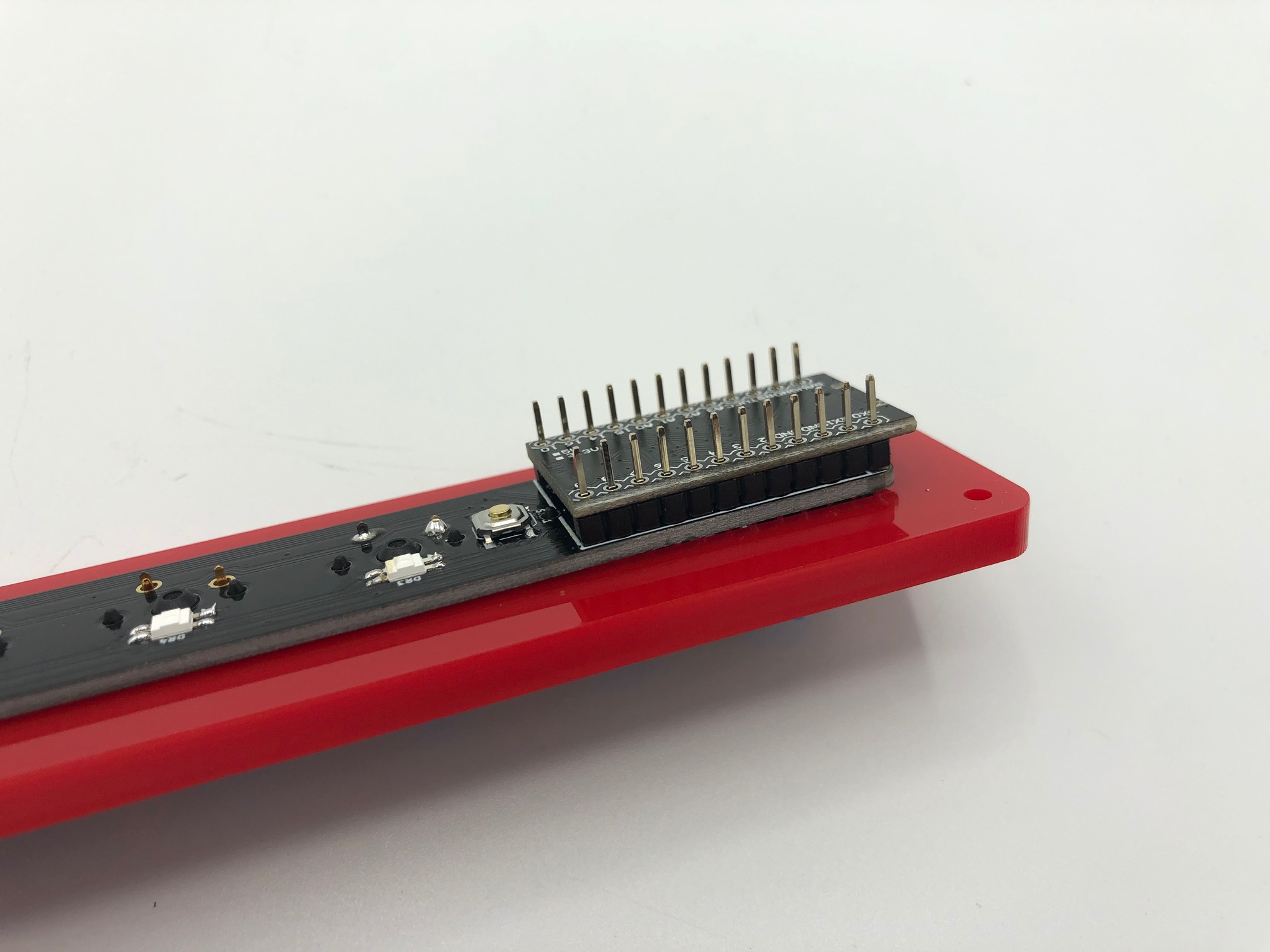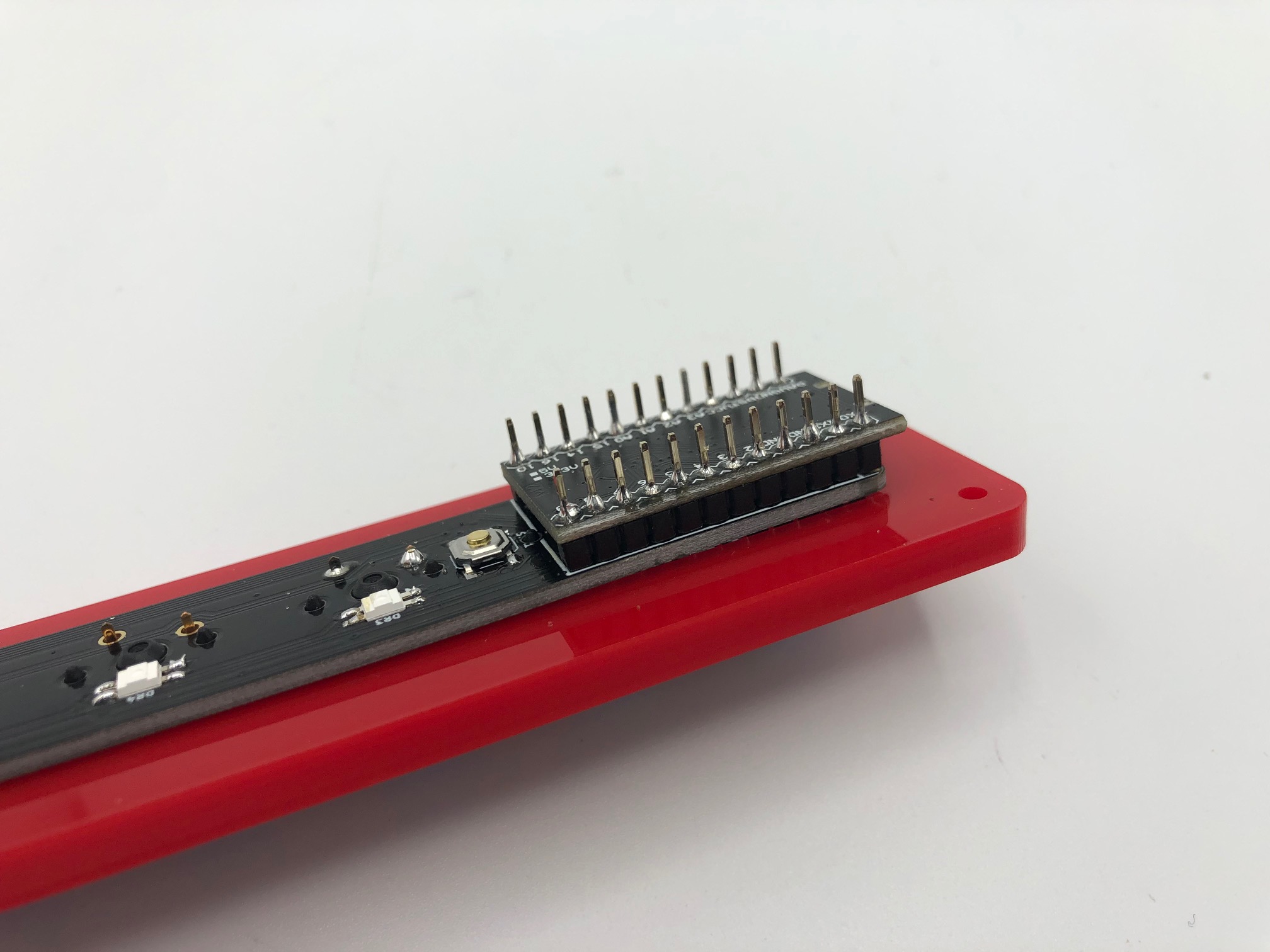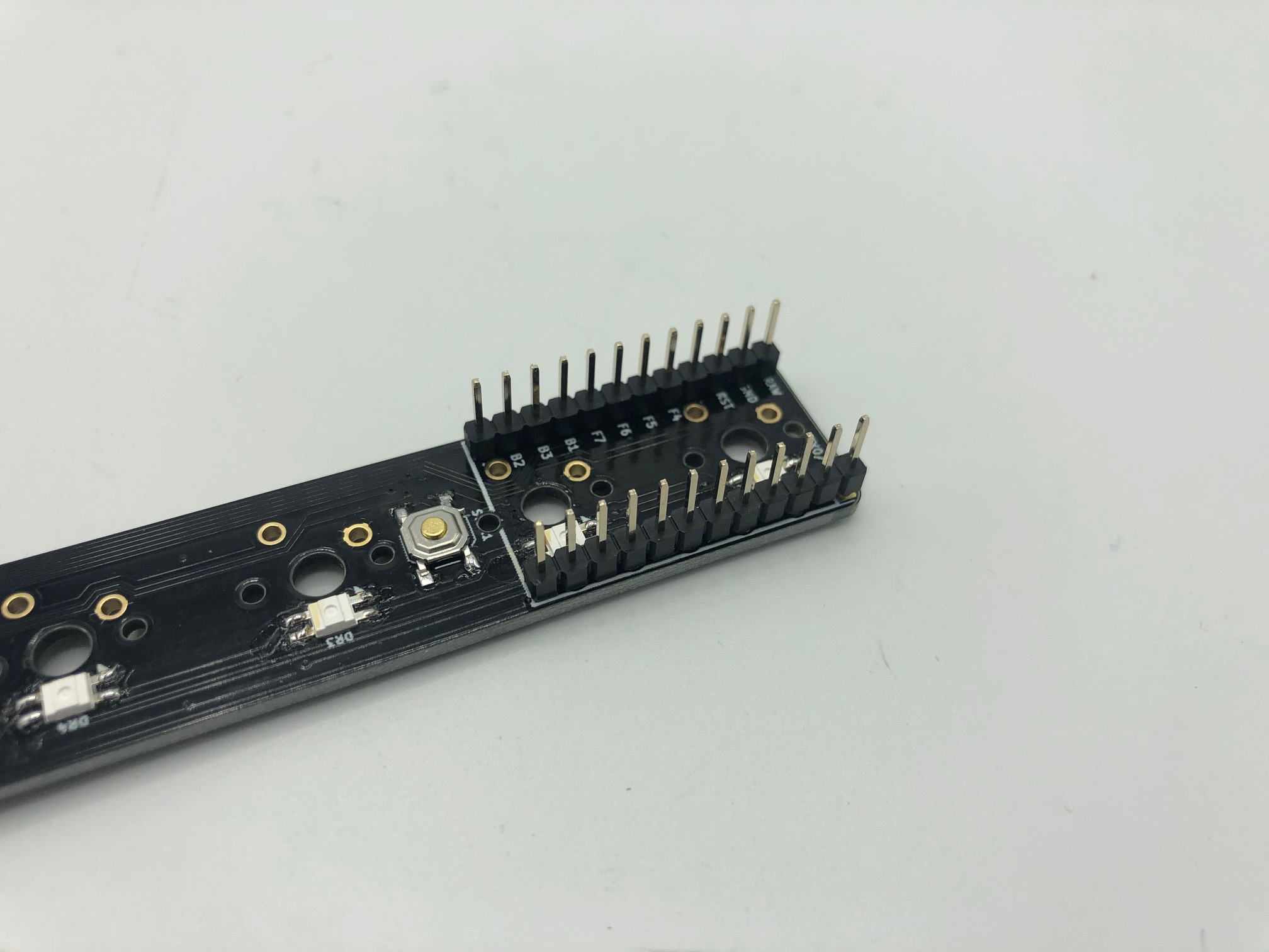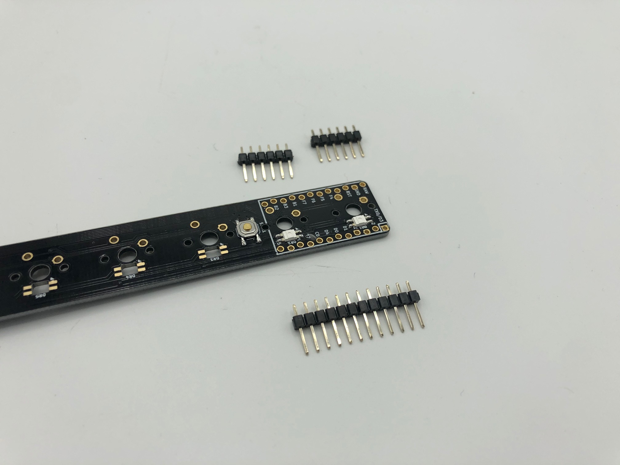 Insert the 6-pin header upside-down in the Pro Micro slot on the PCB. Make sure the PCB is flat on the table. The pins should be able to stand up on their own when inserted.