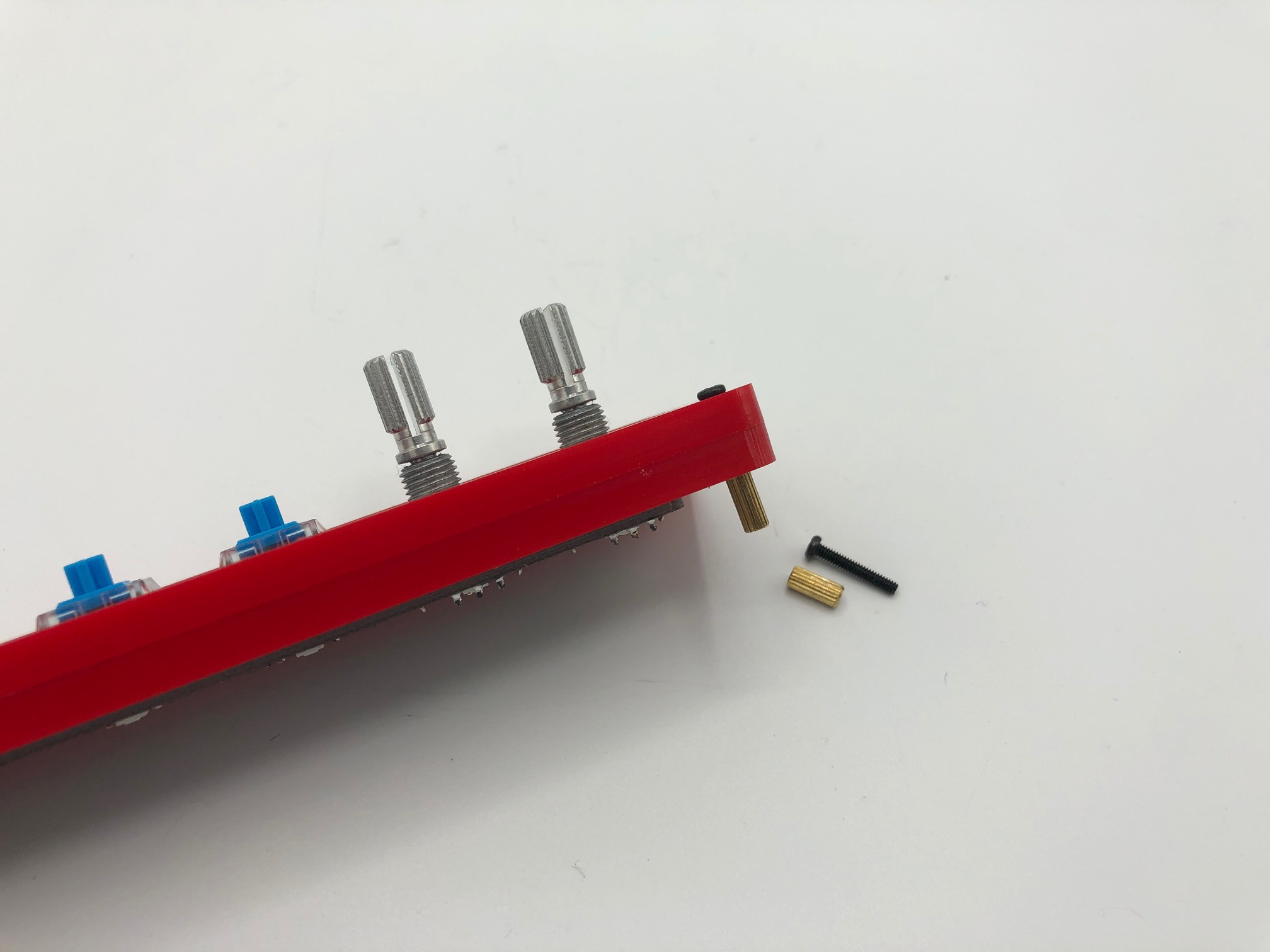 Insert a 12mm screw through the top of the top shell and the switch plate and attach a standoff from the bottom side of the plate: